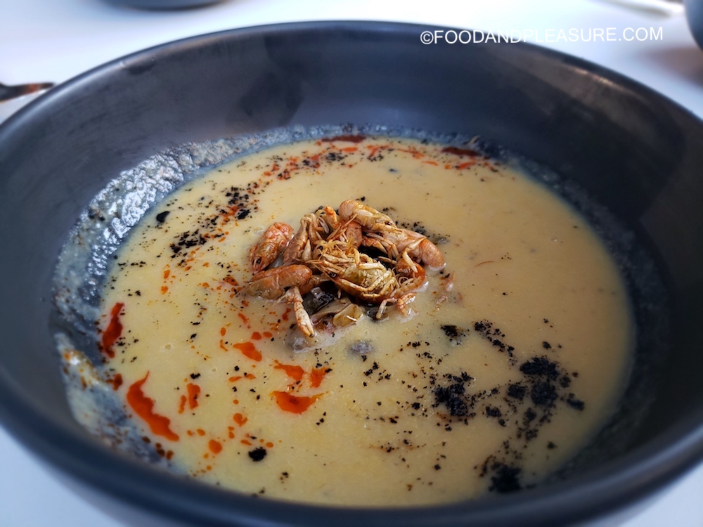 Sopa de Maiz y Acociles- Maíz dulce rostizado, huitlacoche salteado con epazote, acociles, aceite de chiles y cenizas, su textura cremosa la hace sumamente reconfortante.