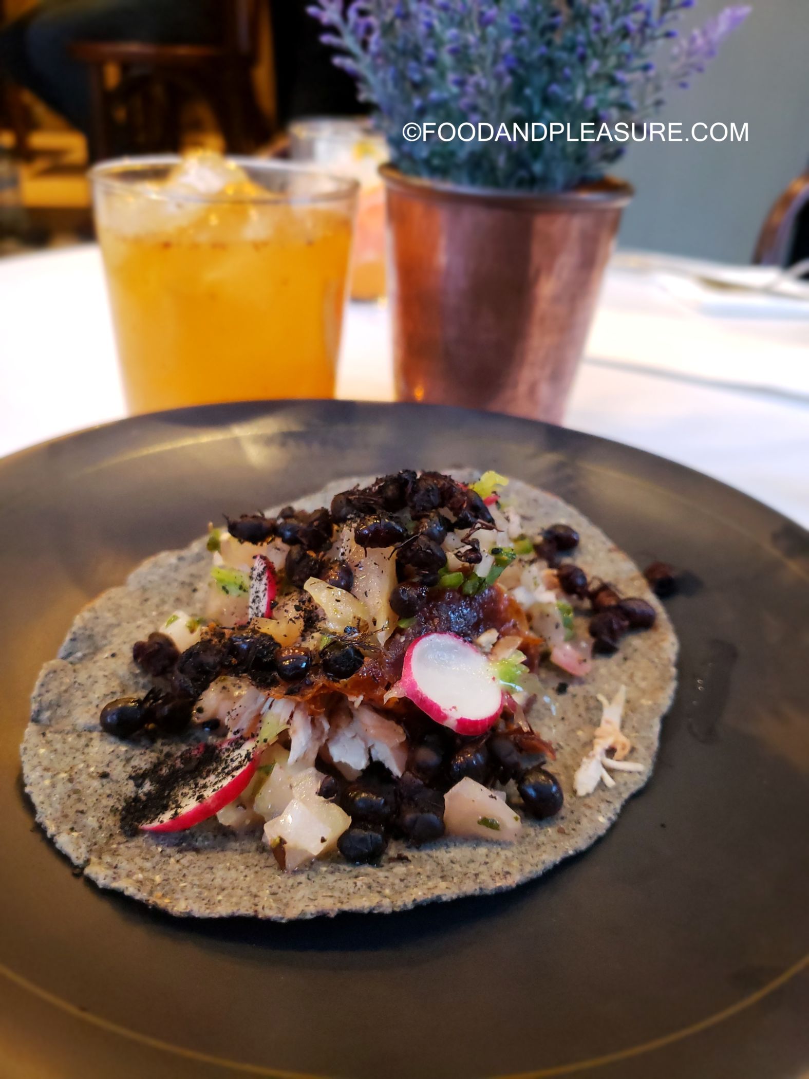 Taco de pollo y hormigas- Sobre tortilla azul, pollo adobado encostrado con hormiga chicatana, salsa de xoconostle y serrano. Picaban bastante, eso sí, pero no pudimos dejar de comerlos, eran ideales.
