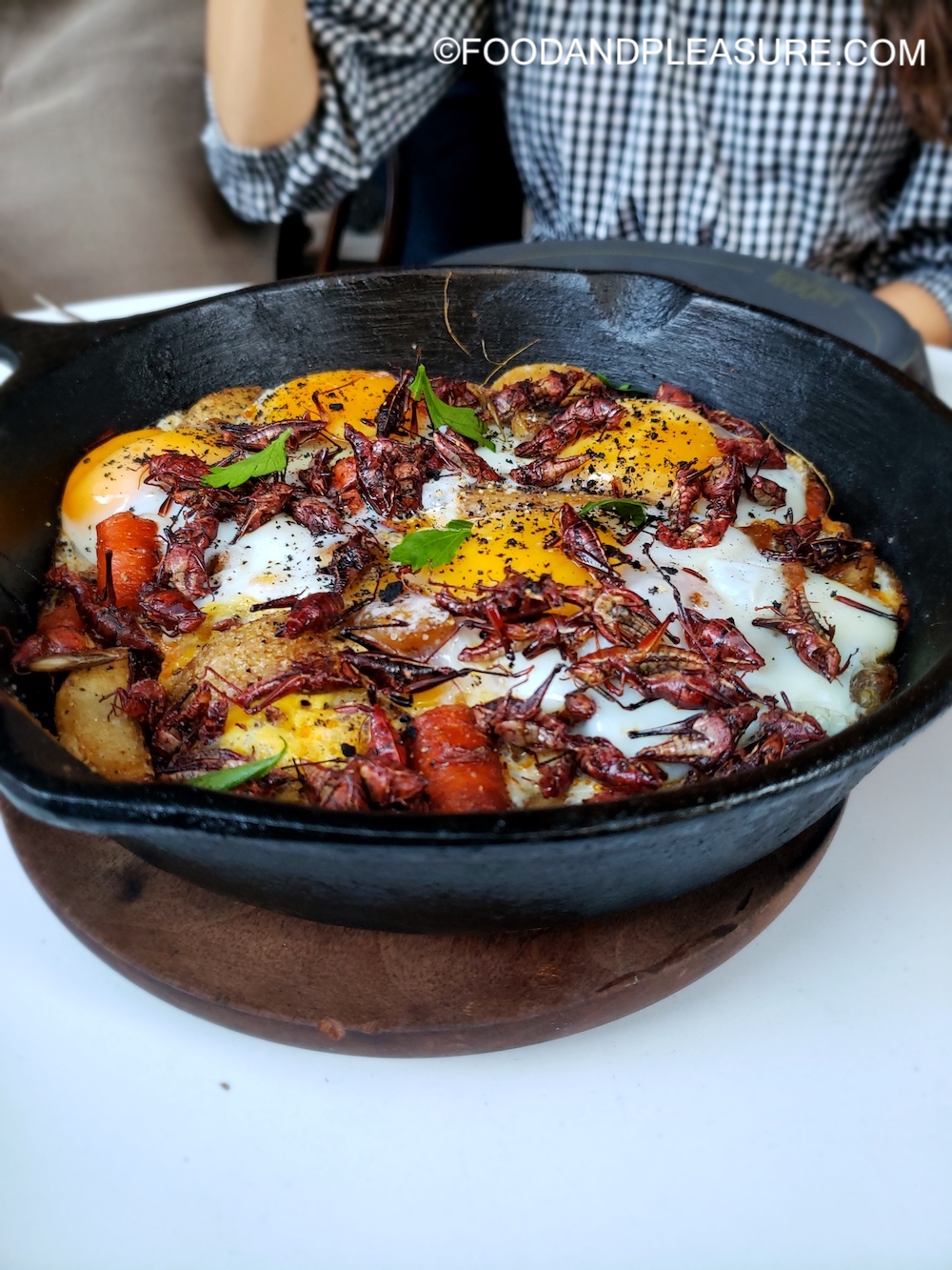 Huevos Rotos- Huevos estrellados sobre papa cambray rostizada, chistorra rostizada y chawis con ajo. ¡Sabor, sabor y sabor! Los chawis lo vuelven de otro mundo. Todo acompañadito con taco de nopal con guacamole, queso fresco y chapulines rostizados.