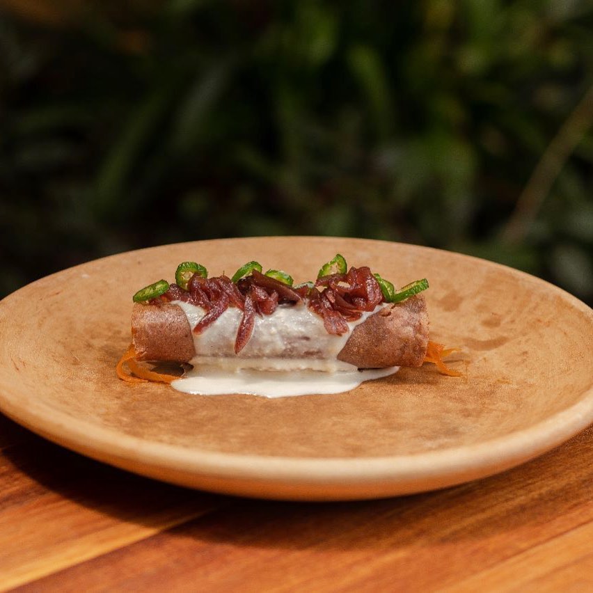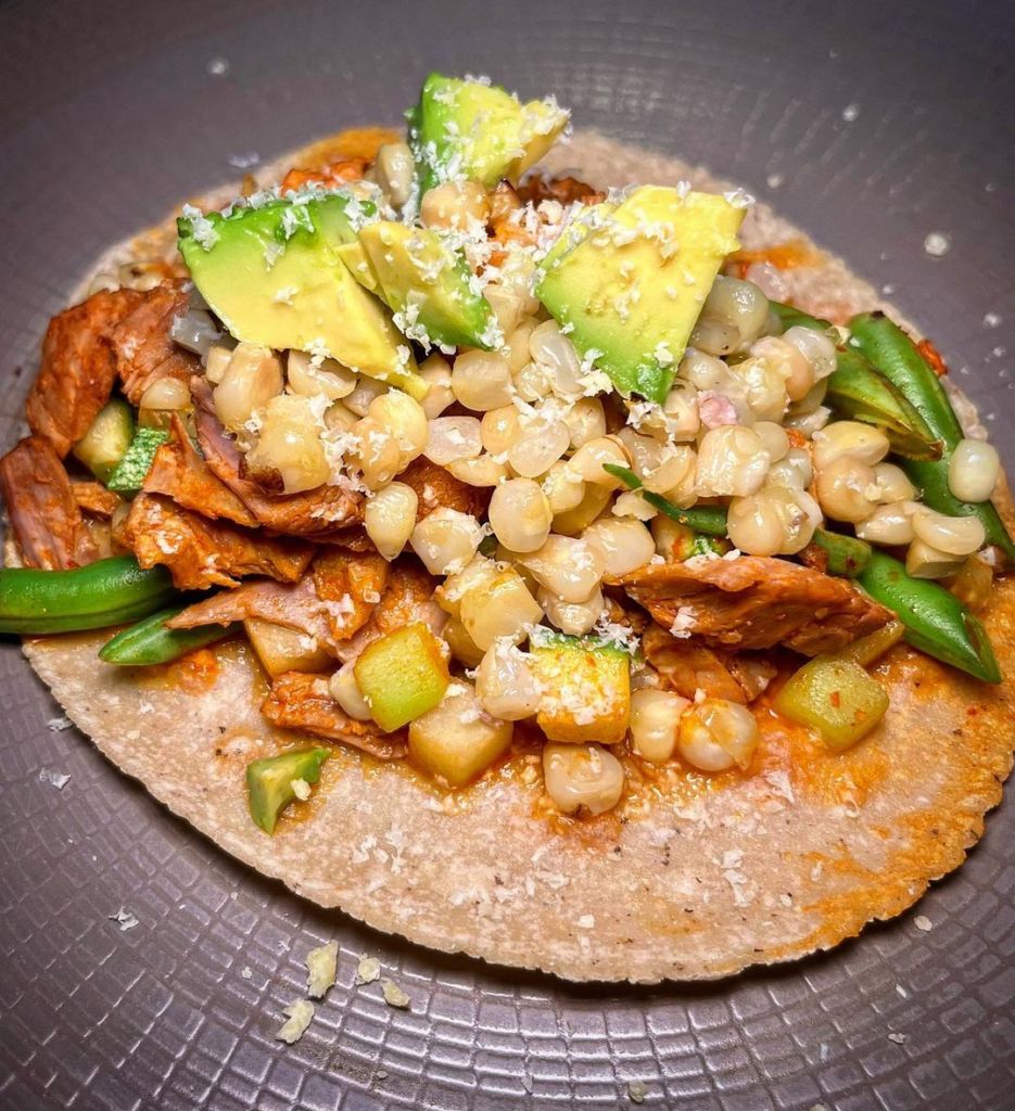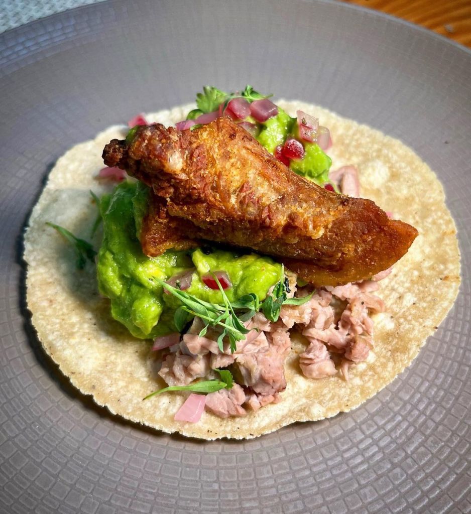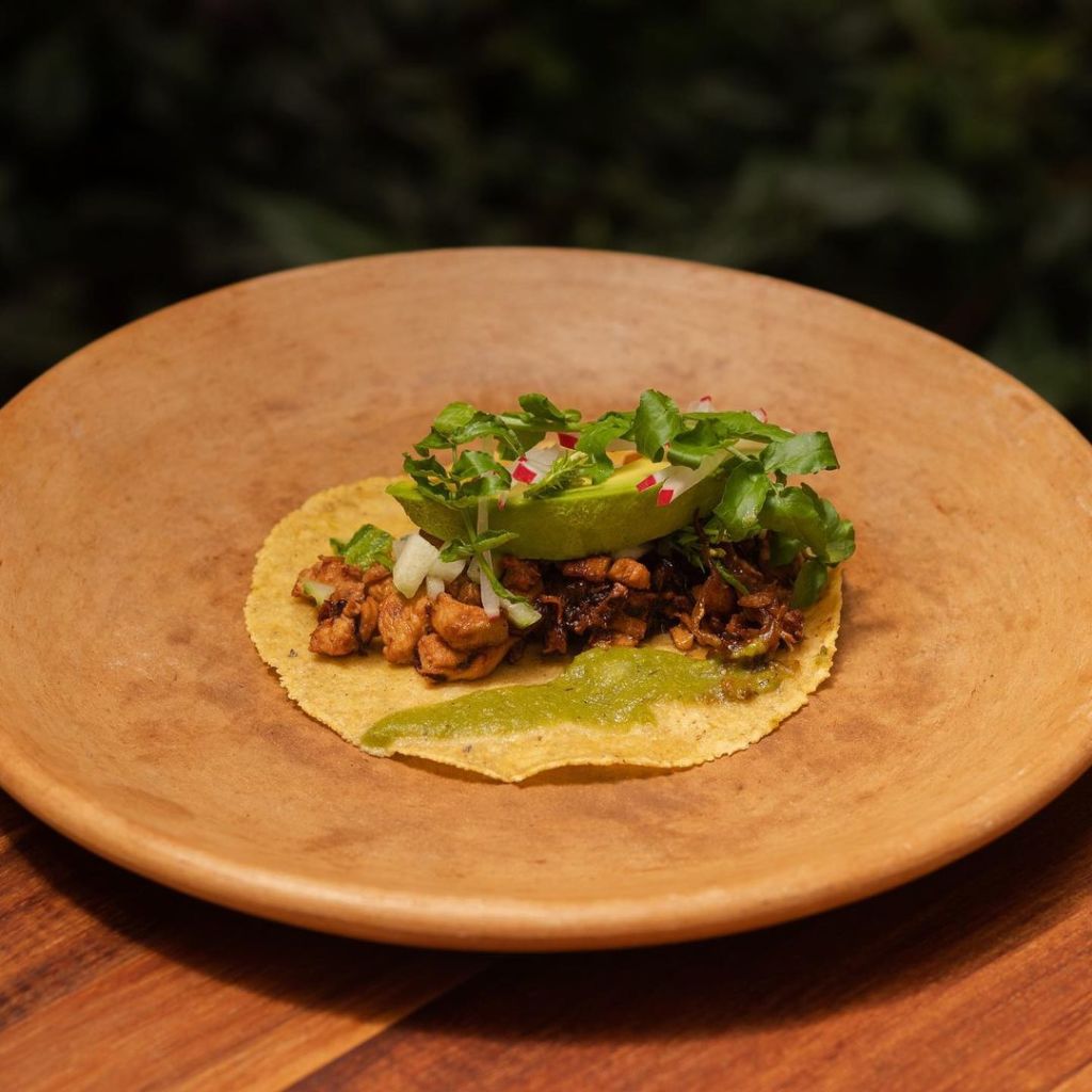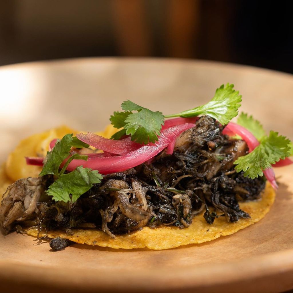 Ahora dejamos volar el paladar a San Cristóbal de las Casas, donde el chef Jorge Gordillo dirige la cocina de Tarumba con un amor profundo a sus raíces chiapanecas. Él nos presenta con tres recetas muy distintos, pero igual de deliciosos e innegagablemente mexicanos: un taco de conejo encenizado sobre una cama de camote (en la cultura tzotzil se cree que los años que pasas en el mundo de los vivos serán los que pases en el mundo de los muertos; la ceniza representa esa dualidad vida-muerte), un taco cafeto de pollito de leche con café (uno de los cultivos insignia de Chiapas), y para los que no comen carne, un taco de tinga de setascon cebolla caramelizada y una crema de cuatro quesos que podría resultar adictiva.
