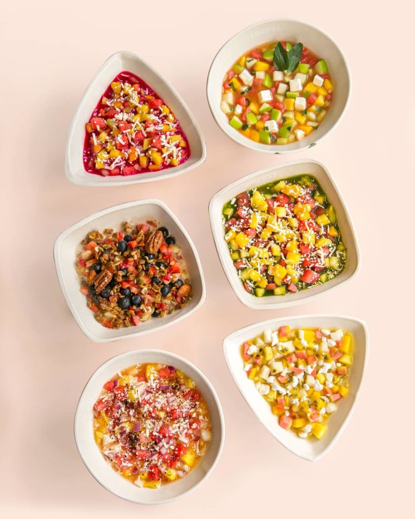 En Amamba Gaspacheros quisieron traer ese sabor callejero de los gaspachos y darle un toque más gourmet con creaciones propias que probaron con su familia y amigos. Tienen cinco estilos de gaspachos: el tropical que lleva maracuyá y papaya; el fresco que lleva manzana verde y queso feta; el verde que lleva una base de jugo con espinacas, jengibre y espirulina; el rojo que se hace con una base de jugo de betabel y cúrcuma y lleva entre las frutas carambola, sandía y piña; y el gaspacho apapacho que es el vegano con leche de coco, frutos rojos, granola y avena.