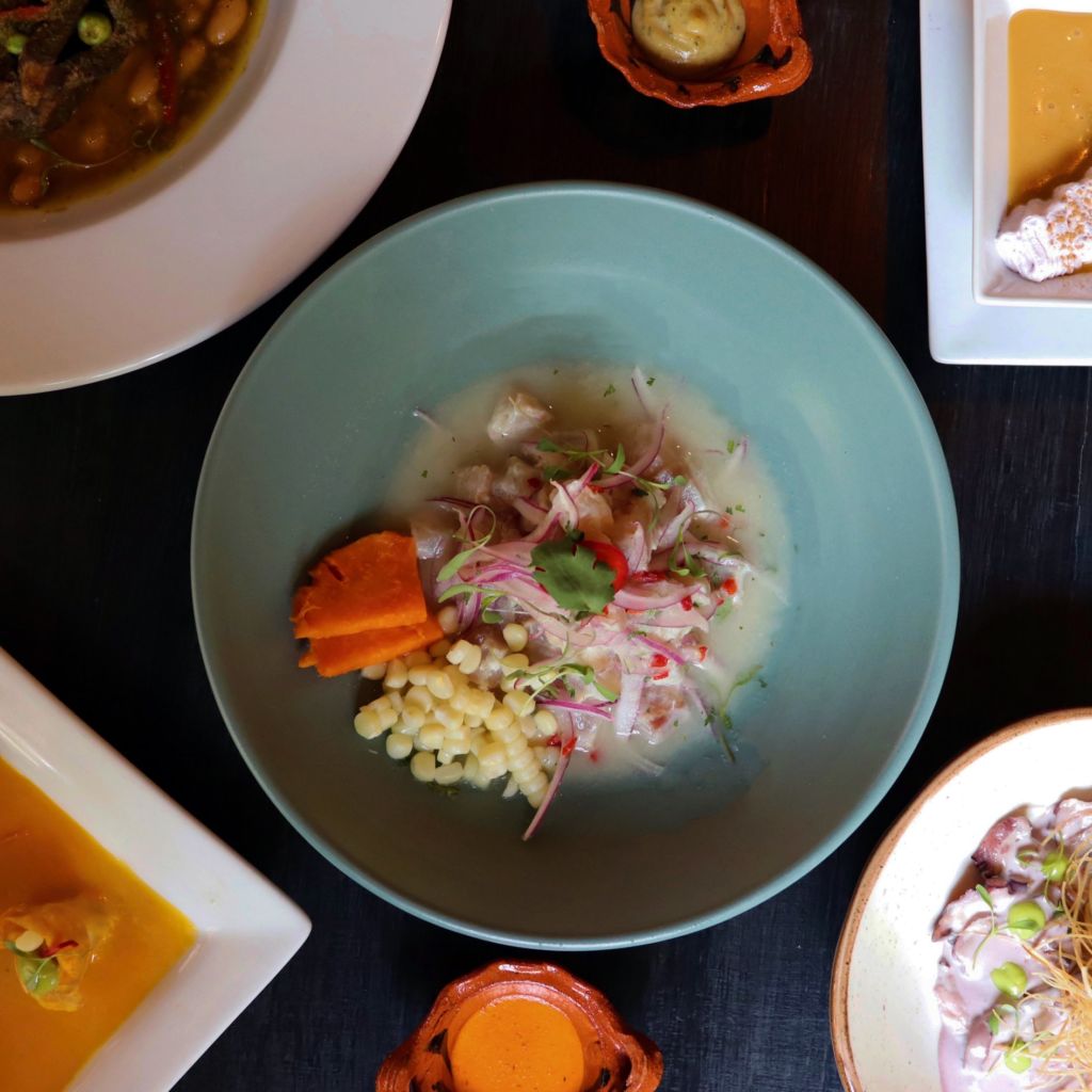 La comida peruana es deliciosa y por suerte ligera. Te recomendamos comenzar con un Pisco Sou y como entrada un Cebiche Clásico, preparado con pescado cocido en jugo de limón, leche de tigre y acompañado de camote y granos de elote –choclo en Perú–.