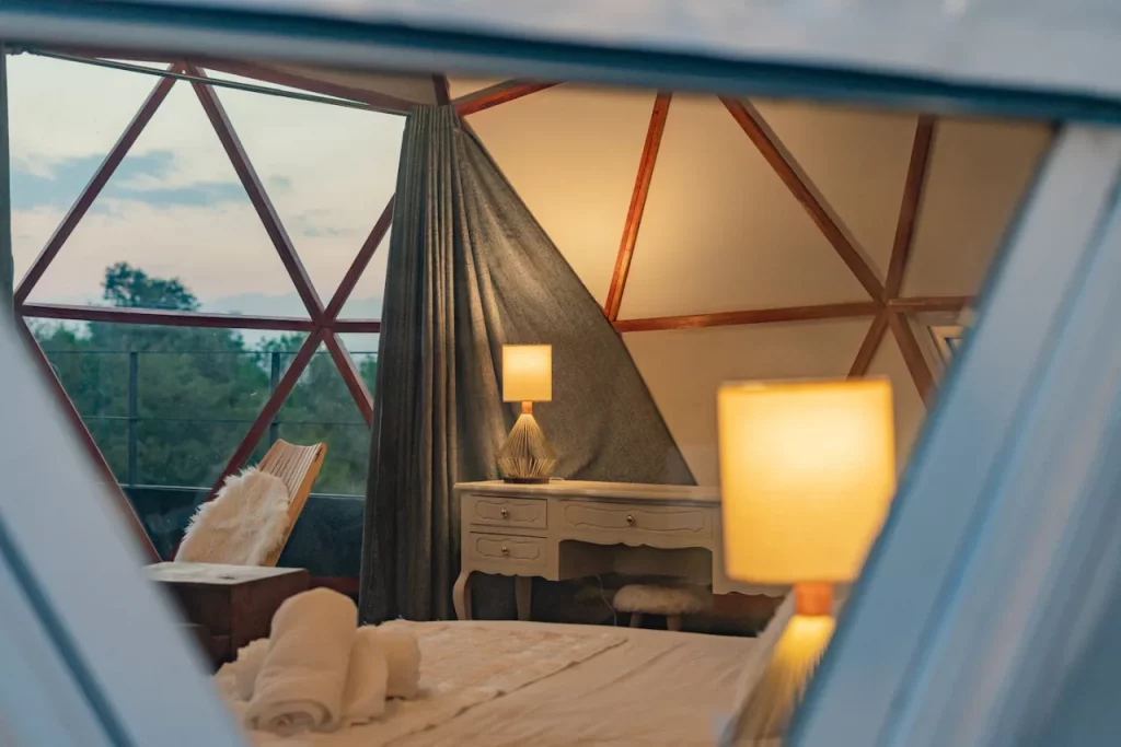 Localizado en un punto estratégico de la Condesa – a unas cuantas cuadras del Parque México -, este glamping ofrece una experiencia única y de comodidad garantizada. Se conforma por un domo geodésico aislado del ruido y la temperatura, con hermosos acabados de madera que emanan aún más una atmósfera de campamento. Su decoración es sencilla y campestre, perfecta para ceder el protagonismo a su estructura circular con grandes ventanales de cristal.