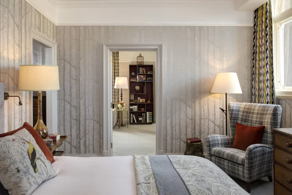 En los muros recubiertos con un papel tapiz de tonos tenues que nos transportan a un bosque encantado, resaltan detalles que remiten al mundo mágico de Harry Potter, como una ilustración de la portada de la última novela, las estrellas que brillan en el pasillo de la entrada y las estanterías repletas de libros. Además, por toda la habitación resaltan detalles que aluden a la campiña escocesa —donde se encuentra el mítico colegio Hogwarts de Magia y Hechicería—, y desde los ventanales se pueden apreciar las vistas de ensueño de Calton Hill.
