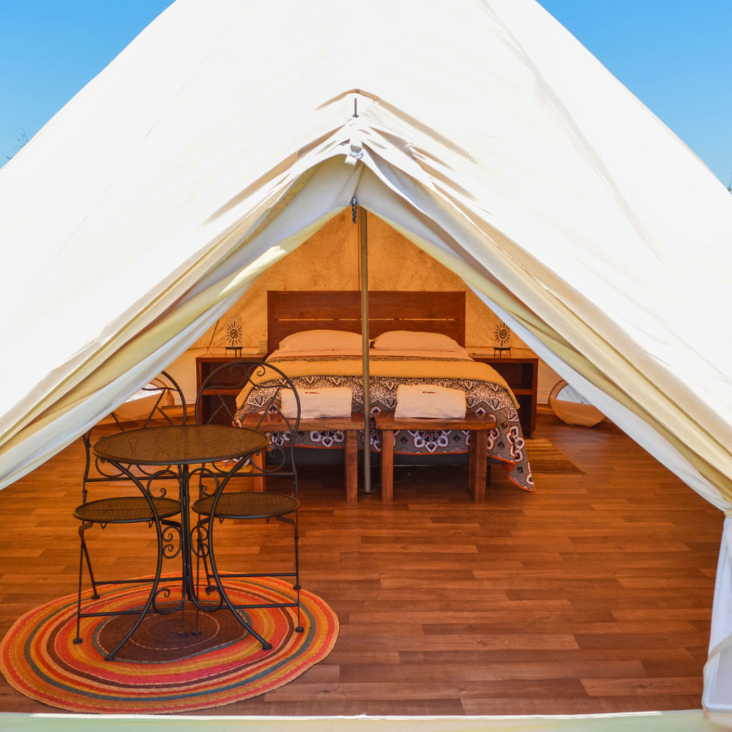 Cada uno de los tents de Hameki cuenta con cama king size o individual, tapetes, cobertores, luz tenue, baños privados, mesas individuales y una pequeña terraza; también permite disfrutar de amenidades orgánicas de productores locales. En el complejo encontrarás áreas comunes como jardines, mesas de madera, zonas de descanso, lago, zona de parrillas y alberca.