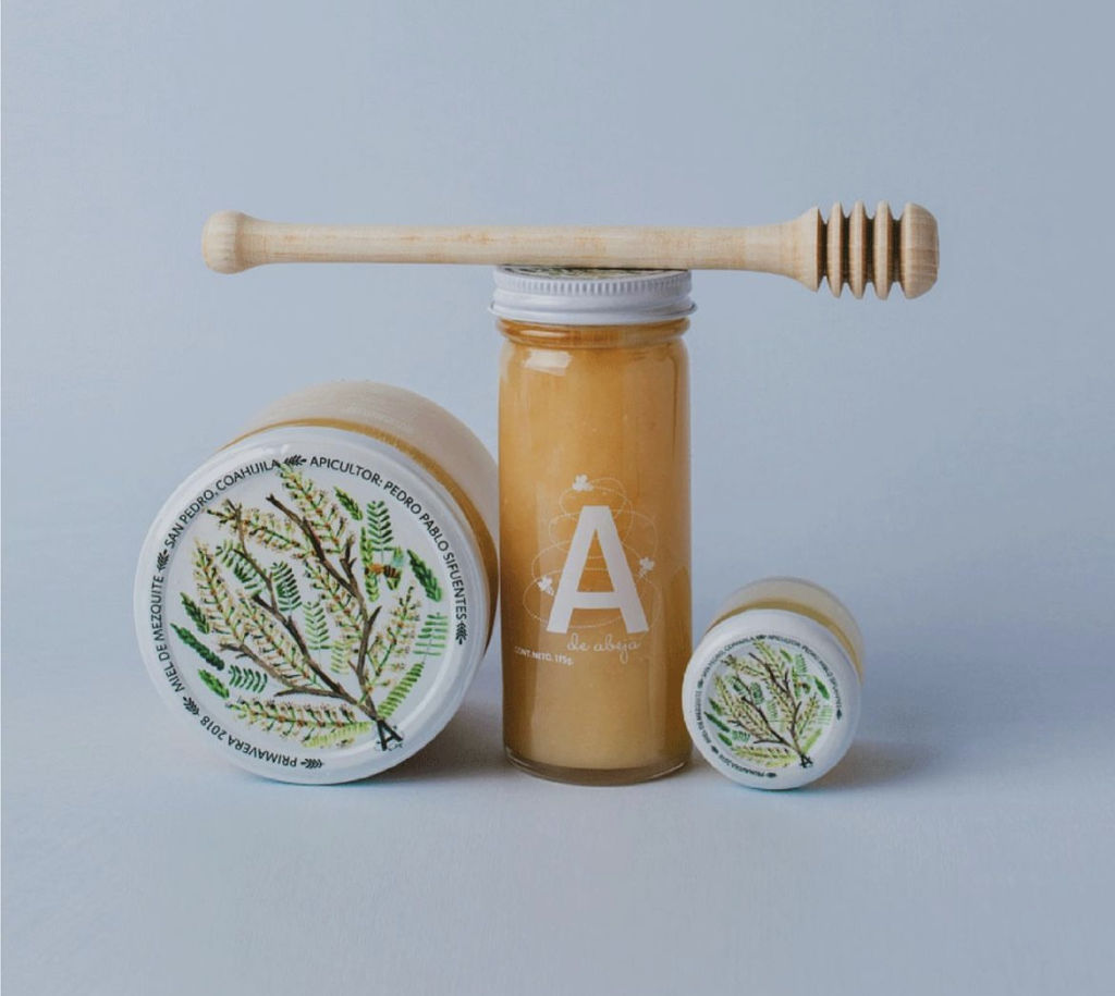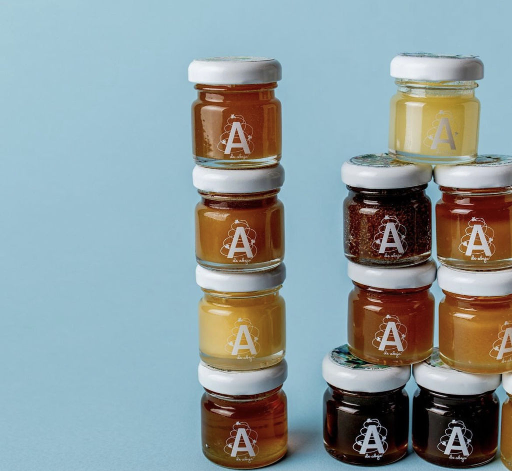 La familia de A de Abeja está compuesta por doce personas –apicultoras– dedicadas exclusivamente al mercado local. Quienes cuidan meticulosamente sus cosechas, seleccionando áreas con suficientes flores, libres de agroquímicos y manteniendo las colmenas en el mejor estado. Su colección de mieles agrupa dieciocho floraciones distintas producidas por la misma especie de abeja –apis melífera o abeja europea–. Sus procesos de cosecha, extracción y envasado son en frío, por lo cual conservan todas sus cualidades botánicas, como: sabor, olor y textura de la miel.
