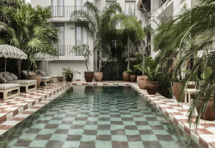 Definitivamente, uno de los espacios más especiales de este hotel boutique en Tulum es su jardín con alberca, decorado con un piso damero en colores blanco y naranja que le brindan al lugar una atmósfera clásica. Hotel Panamera no solo labora como un alojamiento, sino también como una comunidad que busca reunir arte, diseño, gastronomía y música, esto a través de diversas propuestas que se encuentran abiertas al público en general.