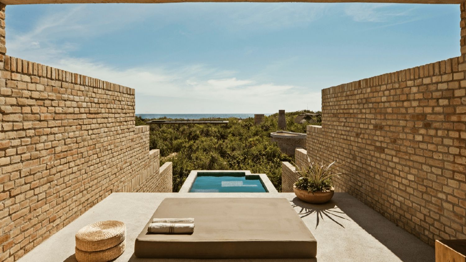 Cada una de las 14 villas de Terrestre tiene su propia terraza y alberca privada y crea una experiencia orgánica que se funde con el paisaje a partir del uso de materiales como la madera, el concreto, el ladrillo y los textiles naturales, todos expuestos para potenciar las virtudes de sus colores y texturas; cada uno de los elementos que conforman el diseño de interiores fue hecho a mano e impregnado con olor a copal para enaltecer aún más a los sentidos y el espíritu místico del lugar. Aquí, las puertas se abren de par en par para recibir al ecosistema que envuelve al hotel e invita a los huéspedes a pasar el día en las hamacas y sillones de la terraza con vistas hacia el océano Pacífico.