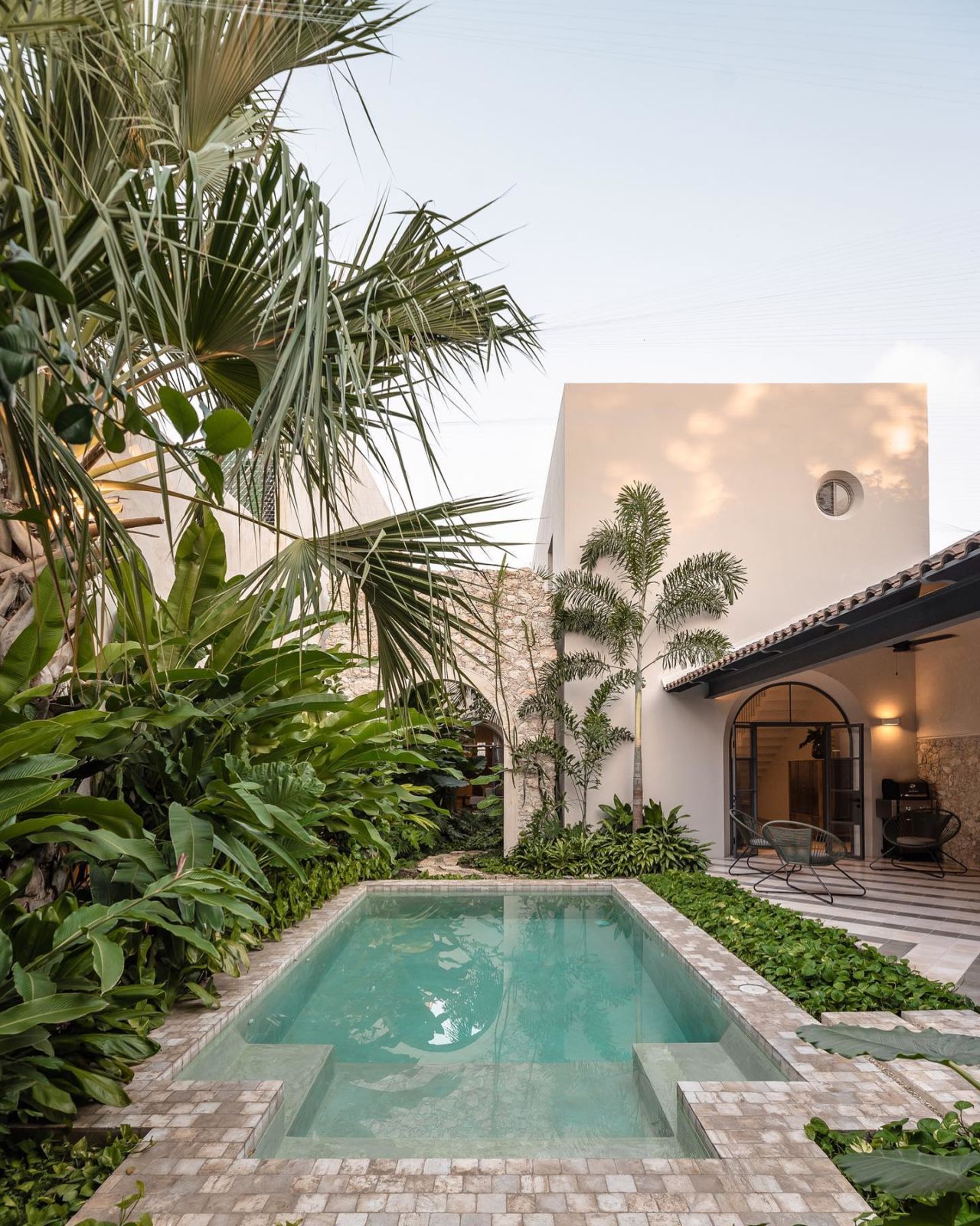 Por otro lado, sus entradas arqueadas y sus acentos de decoración curvo tanto en puertas como en ventanas, crean una perspectiva de lujo antiguo. A través de ellas, se llega a sus pacíficos jardines y a la piscina de agua turquesa, que invita al visitante a sumergirse entre sus espacios, mientras disfruta del cálido clima de Mérida. Un punto muy importante en Casa 52, es ofrecer una residencia donde el visitante se sienta cómodo, por ello, este lugar solo admite a seis personas para hospedarse.