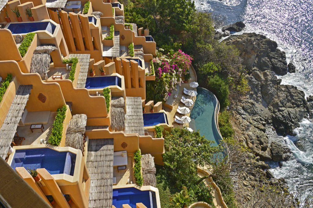 Uno de los hoteles más top, sin duda, es Cala De Mar. Este destino es ideal para parejas, ya que cada una de sus habitaciones cuenta con alberca privada y la mejor vista del Océano Pacífico. Algo que caracteriza a Cala de Mar es su arquitectura, la cual se forjó sobre un acantilado, dando la ilusión de una pequeña ciudad en el cielo. Este espacio cuenta con restaurantes de lujo, dos infinity pools con vista al mar, spa y amenidades de lujo.