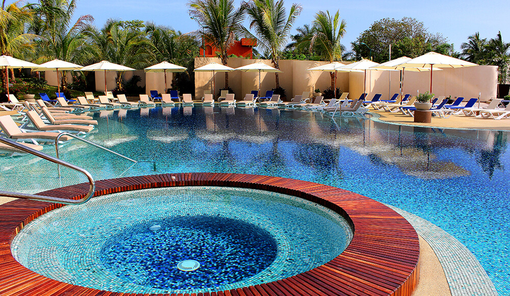 Este hotel all inclusive está ubicado en la franja de Playa Curva, una de las más bellas de Ixtapa. Azul Ixtapa Grand es la versión de lujo de su hermano del mismo nombre, un sitio de habitaciones exclusivas con vistas espectaculares al mar o a la bahía Ixtapa, además de acceso a una de las zonas más bellas de la Riviera Mexicana. Durante tu hospedaje podrás disfrutar el jacuzzi en la habitación, los desayunos en la terraza y un kit de spa de 30 minutos – su spa es uno de los más grandes de la zona, con 18 cabinas de masaje, albercas de sensaciones y rituales en pareja -.