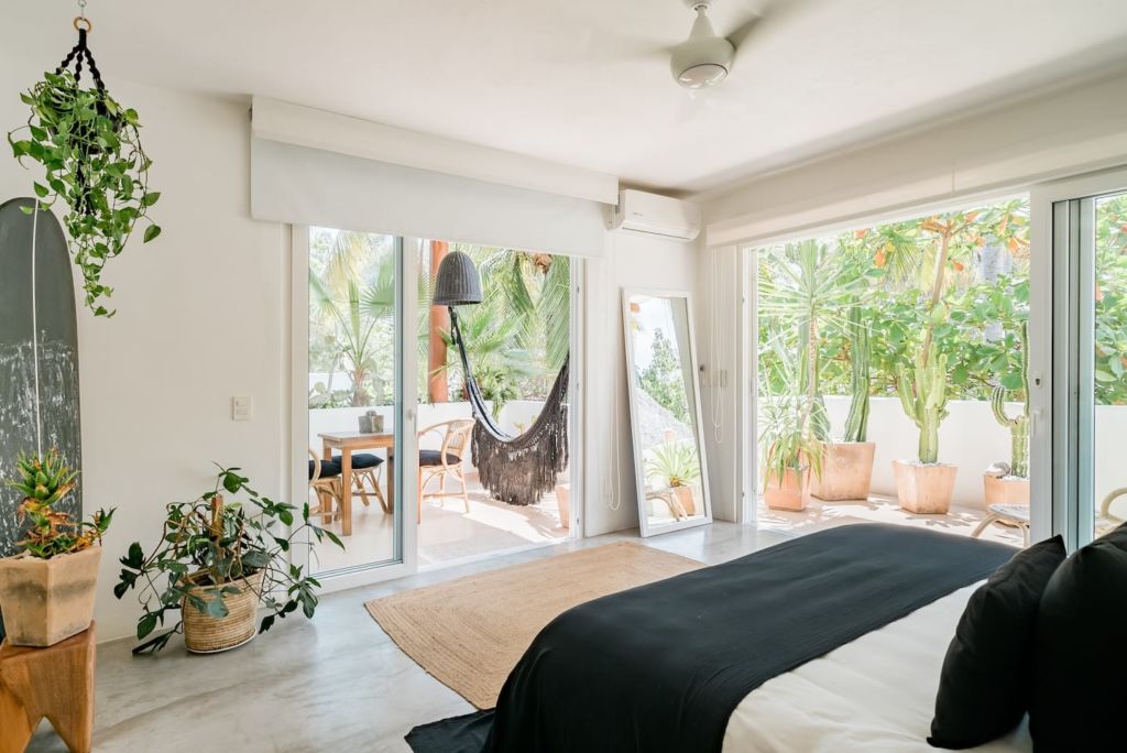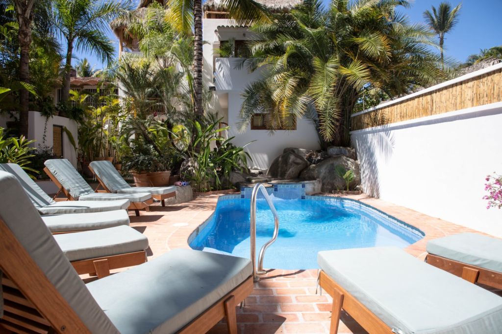 Este es uno de los hoteles en San Pancho donde encontrarás un lugar tranquilo y natural. Es pequeño, cuenta únicamente con seis habitaciones y dos palapas, por lo que es perfecto para quienes buscan una experiencia íntima y privada. Su diseño es contemporáneo costero, con espacios iluminados naturalmente, un hermoso jardín lleno de vegetación y una alberca salada.
