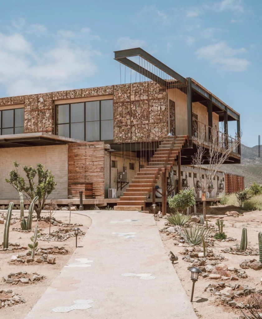 La identidad del diseño este hotel boutique en el Valle de Guadalupe se articula a través de la sostenibilidad, procurando que los espacios sean lo menos invasivos posible con el entorno. El hotel cuenta con 24 habitaciones y cabañas estilo glamping (todas pet friendly), y además de las vistas del viñedo, podrás refugiarte del clima semi-desértico en el carril de nado. Además, el Eco Spa cuenta con servicio de temazcal, hidroterapia y tinas de masaje y regeneración celular para que pases las vacaciones más revitalizantes de la vida.
