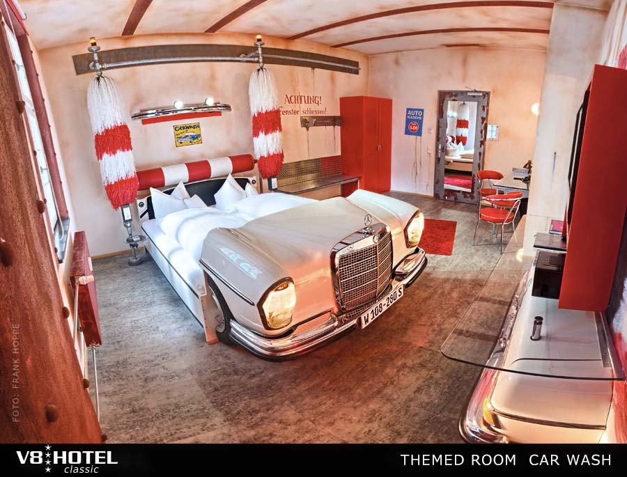 Para los amantes de los coches este hotel es un must. Tienen habitaciones que emulan un autolavado, otras son un tributo a los autos deportivos. También hay de autos clásicos y gasolineras. Lo maravilloso de cada espacio es el diseño, que se compenetra a la perfección con el mundo del motor. Este alojamiento alemán, sin duda, encantará a más de uno.