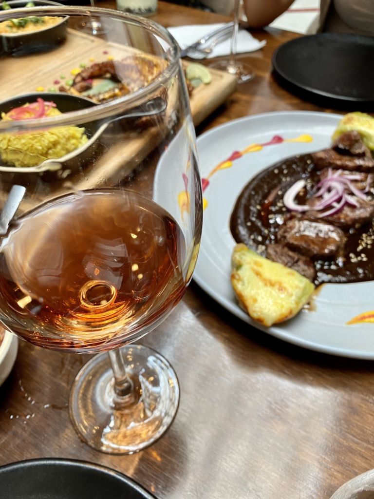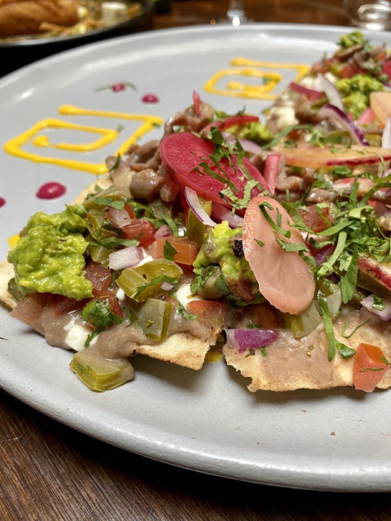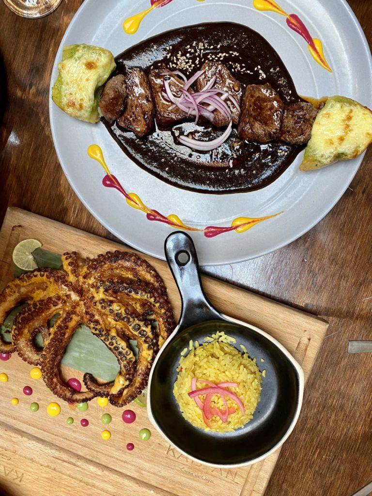 En cuanto a las entradas no puedes perderte la tlayuda, la tortita ahogada, el taco del Pacífico – de camarón empanizado con amaranto – y el aguachile verde. Luego, para el plato fuerte nos encantó el costillar Aruma – horneado durante nueve horas y glaseado con miel de agave y chile meco – la carne literalmente se deshace de lo suave y los esquites que lo acompañan son un apapacho al corazón; el pulpo zarandeado – glaseado con salsa de chiles secos y un toque cítrico – y el mixiote de pescado con camarón, pulpo y un toque de salsa macha.