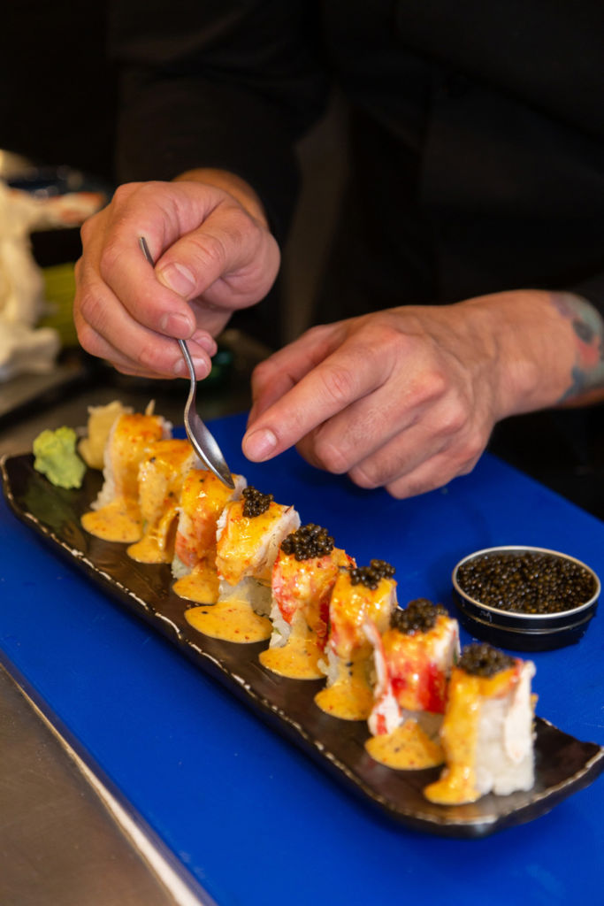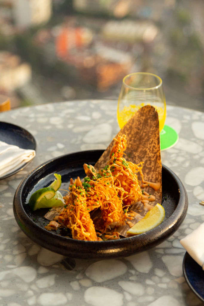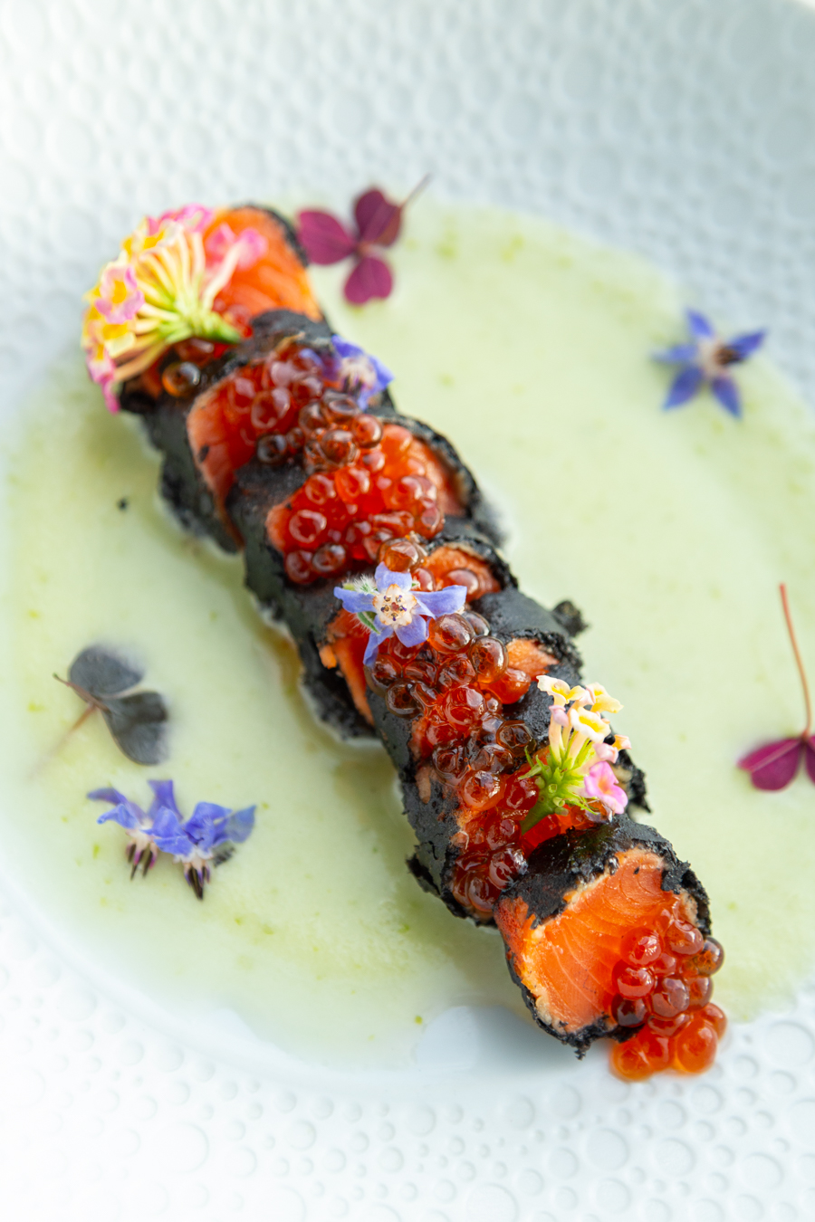 El menú, aunque pequeño, demuestra la creatividad y la sinergia entre la cocina icónica del restaurante y la firma personal de Fernández. Se desarrollaron cuatro platillos (tres salados y uno dulce) y un cóctel, los cuales destacan por la frescura de los ingredientes y la innovación detrás de cada una de estas novedosas e irresistibles recetas. Entre los salados encontrarás el Black Crispy Salmon —salmón temporizado con tinta de calamar, ikura y vinagreta de manzana—, el Camarón Crujiente —envuelto en pasta de spring roll y servido con gochujang alioli— y el King Crab Roll —con cebolla caramelizada, aguacate, tempura crujiente, caviar y mayonesa miso foie gras picante—.