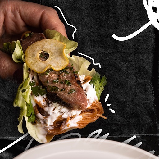 Nudo Negro es un concepto de alta cocina mexicana con influencia internacional, como su nombre lo indica, es una vuelta inesperada en los platos que parten de México, para dar un giro hacia las cocinas del mundo. Ok… quizá este fideo seco no es como el de tu abuelita, pero está verdaderamente delicioso y vale la pena probarlo por su originalidad. Se trata de los ssäm elaborados con lechuga francesa que envuelve fideo seco, filete de res con marinado vietnamita, crema agria y chips de ajo macho. Están espectaculares.