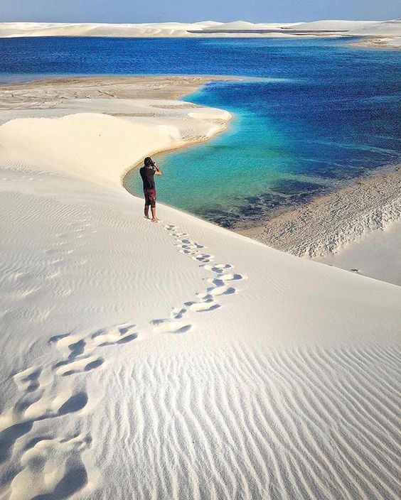 En la costa nordeste de Brasil se encuentran unas maravillosas dunas blancas con vista de media luna. Vistas desde el cielo, las blancas dunas parecen sábanas blancas tendidas sobre el cielo vespertino. Es por esto que este lugar se llama ‘Lençóis Maranhenses’, que significa «sábanas de Maranhão», Este es un insólito ecosistema que combina un desierto junto a charcas pluviales de vivos colores azules y verdes llenos de bancos de peces plateados. Es como si un mar caribeño de pronto se materializara como un espejismo en medio del Sahara.