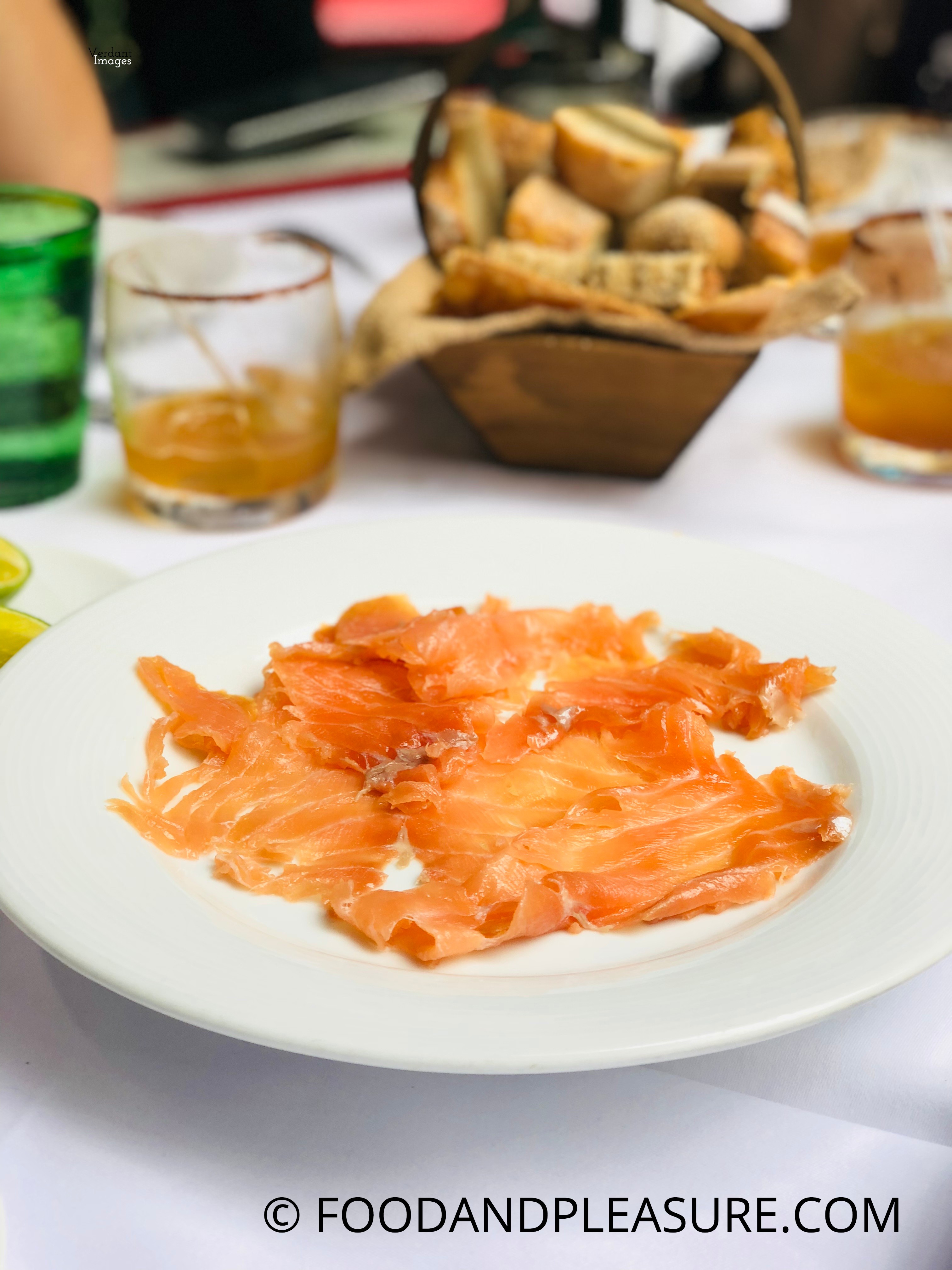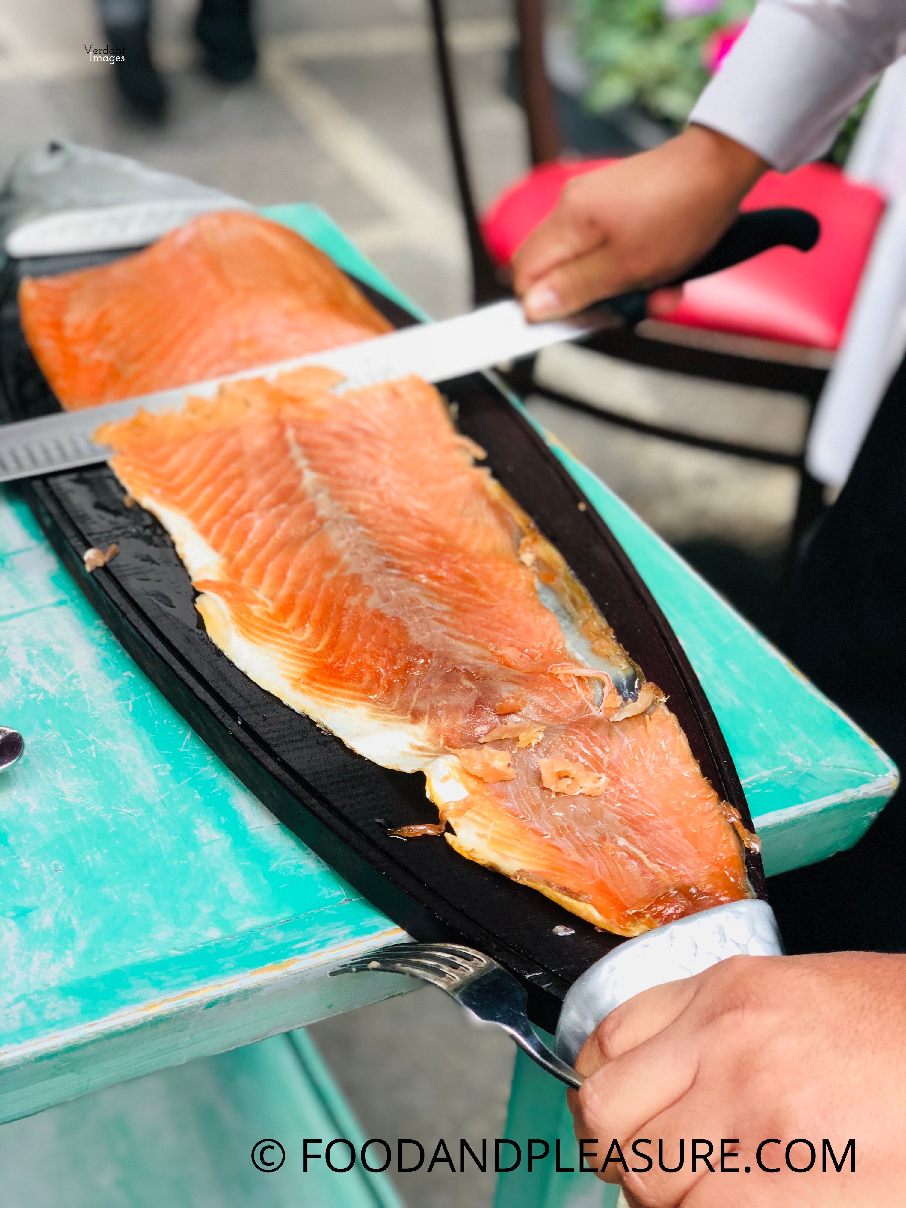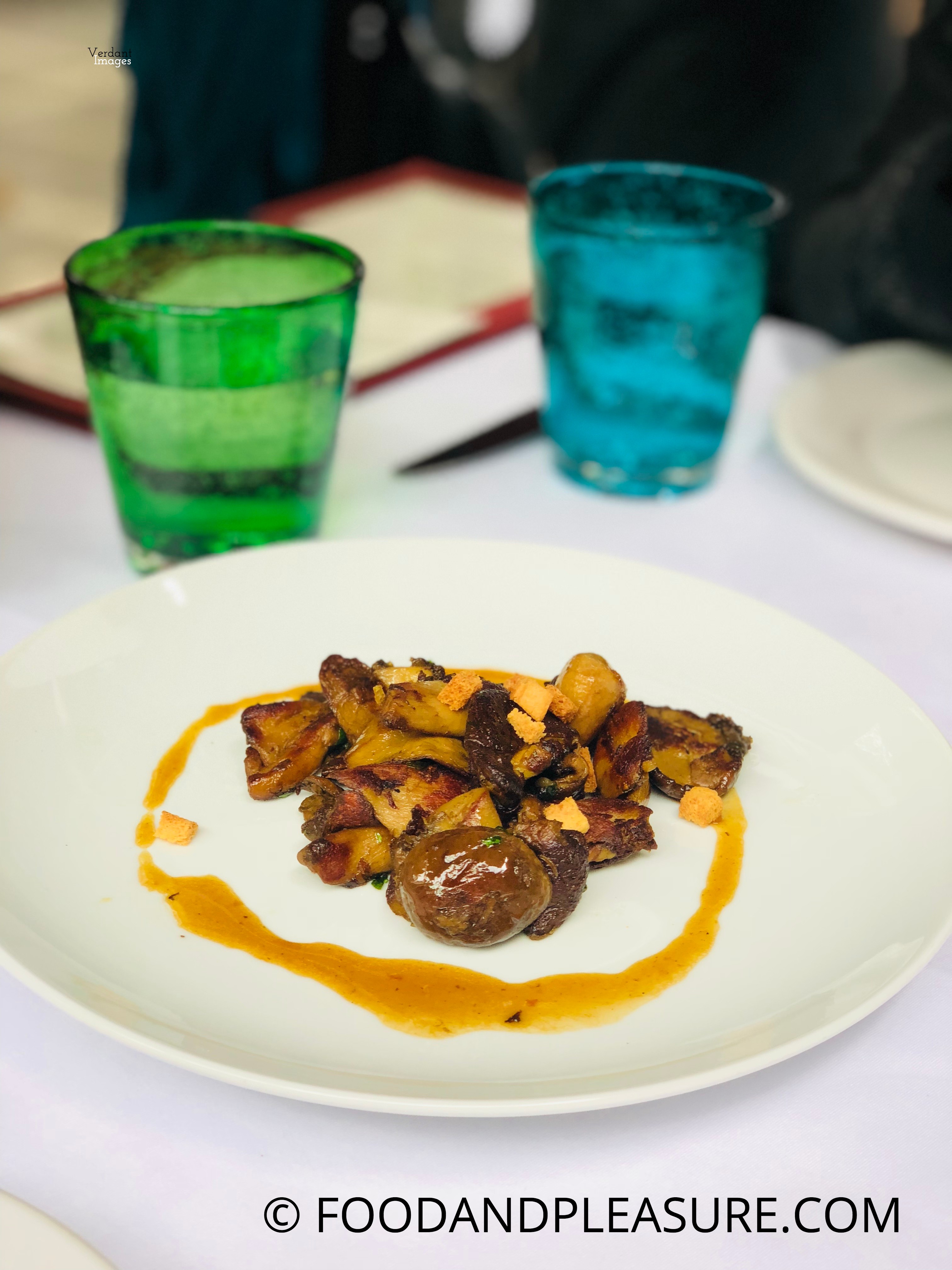 Para dar por inaugurada nuestra comida, nos sirvieron un salmón ahumado en la casa, siempre cortado al momento para resaltar su sabor. Parecía recién salido del ahumador, muy distinto a cualquier otro que hayamos probado antes. Al ser temporada de setas, no podía faltar un platillo con este ingrediente en la carta, por lo que tuvimos la oportunidad de probar las setas salteadas en su jugo, con perejil y ajo.
