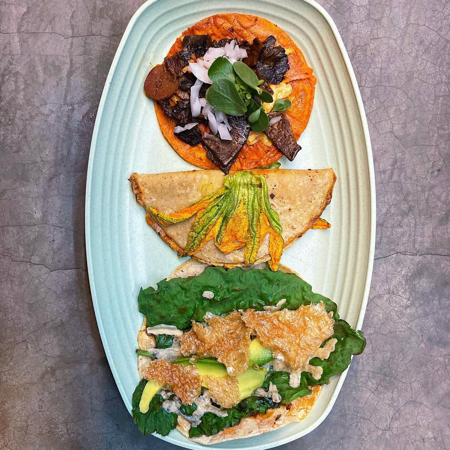 Como toda buena taquería, Malportaco ofrece una atmósfera desenfadada y una cocina donde los detalles importan, desde los guisados hasta las tortillas y las salsas. En su menú puedes encontrar algunas opciones que nos recuerdan los clásicos de carne, como pastor, arrachera chorizo y campechano, o qué tal el taco de panza —que aquí preparan con setas— o el taco de barriga, que hacen con berenjena—. Pero también hay recetas que se enorgullecen de su origen vegetal, como el taco placero —de hoja santa— y el taco de flor enchilado —flor de calabaza y queso de papa y coco con una mezcla de chiles secos—.