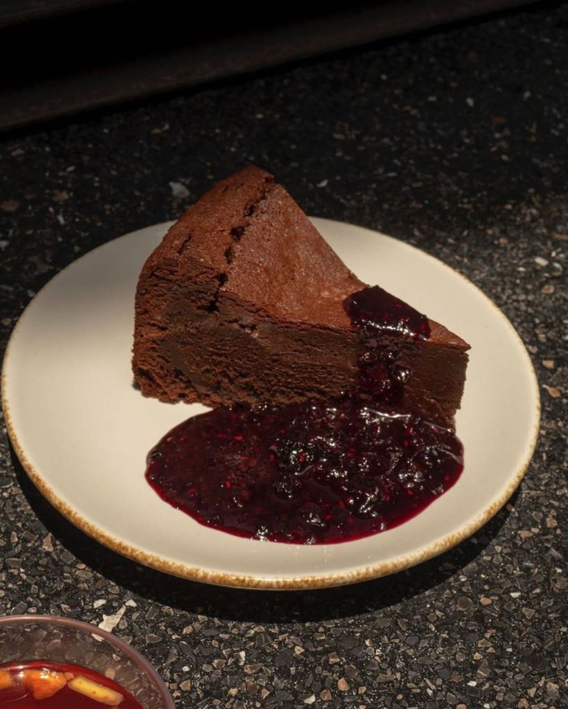 Pasemos, pues, al postre. Aunque este menú no es nuevo, es totalmente digno de mención, porque es prácticamente pecado venir a comer a Bou e irte a buscar el final dulce a otra parte. Lo primero que te recibe al entrar es una vitrina diseñada para echar a andar las glándulas salivales y asegurarse de que no te irás sin darle un cierre azucarado a tu visita. Desde tartas de limón con merengue, tartas de manzana y panqueques de plátano, hasta las estrellas de la casa: la tarta de queso con compota de naranja y jengibre y el Pastel Bou, con chocolate belga y compota de frutos rojos. Son básicamente el paraíso.