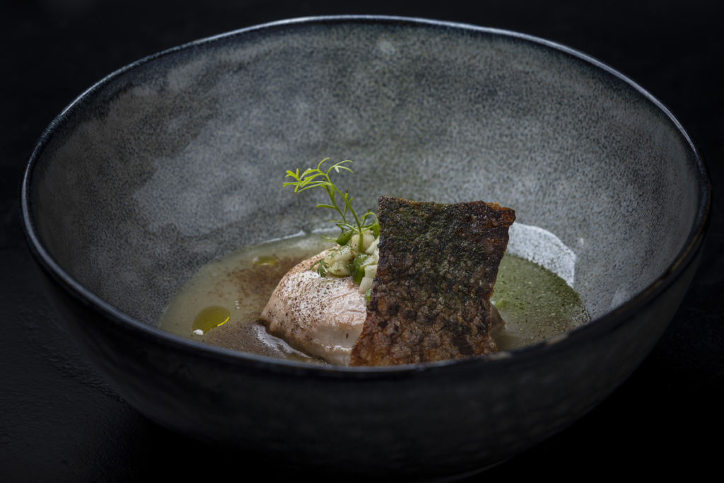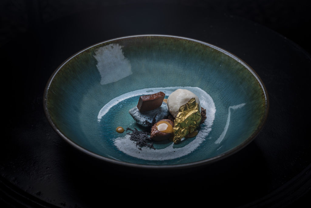 La innovación de los clásicos mexicanos continúa con el chicharrón de camarón y cuernitos de mar, el balance perfecto entre lo crujiente y lo cremoso, y después, un tamal de Civet de Conejo y naranja. El quinto platillo consiste en un filete de lubina con mole de sandía, y el sexto, lechón con mole de olla. Vale la pena notar que, aunque casi todos los platillos hasta ahora incluyen una proteína de origen animal, uno de los fundamentos básicos de un menú de degustación precisa que no se deben repetir ingredientes.