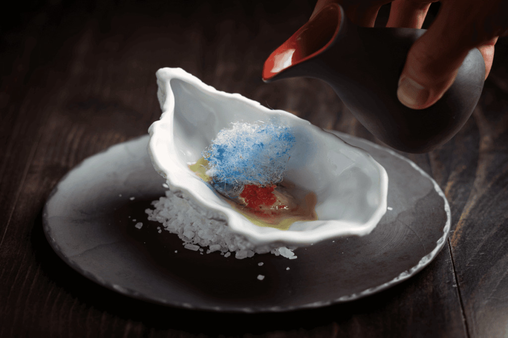 De esta forma, Balcón del Zócalo estrena su menú de degustación Paleta de colores, cuyos siete tiempos se inspiran en la frescura, la luz, la ligereza y, como el nombre lo indica, los colores característicos del verano. Para abrir el apetito, comenzamos con un mochi de aguacate y poblano —un guiño a esa primera influencia japonesa—, seguido de una ostra de la Baja con Mignonette de Kombucha azul.