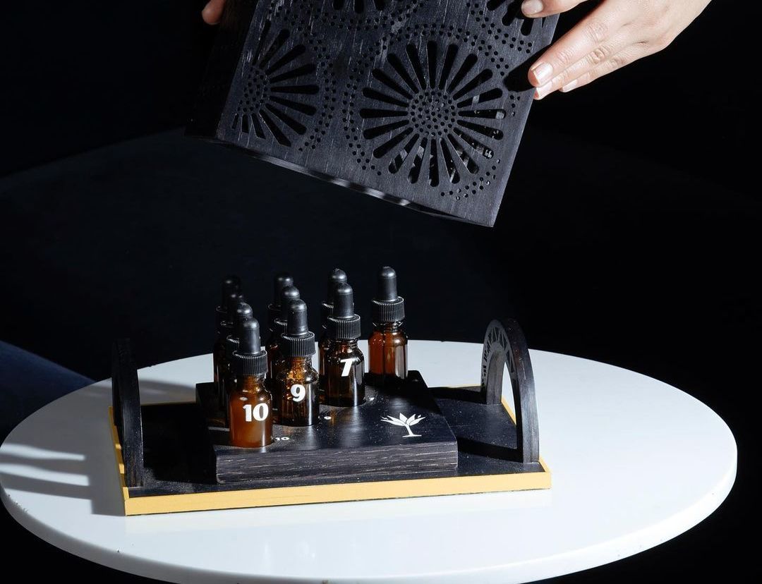 Esta última se conforma por 10 probetas numeradas, cada una resguardando una pequeña cantidad de los tragos disponibles en el nuevo menú de Rayo; el propósito de esta presentación es que los comensales puedan probar cada uno de los tragos antes de pedir su favorito en la versión original, y conozcan mejor el perfil de sabores que prefieren.
