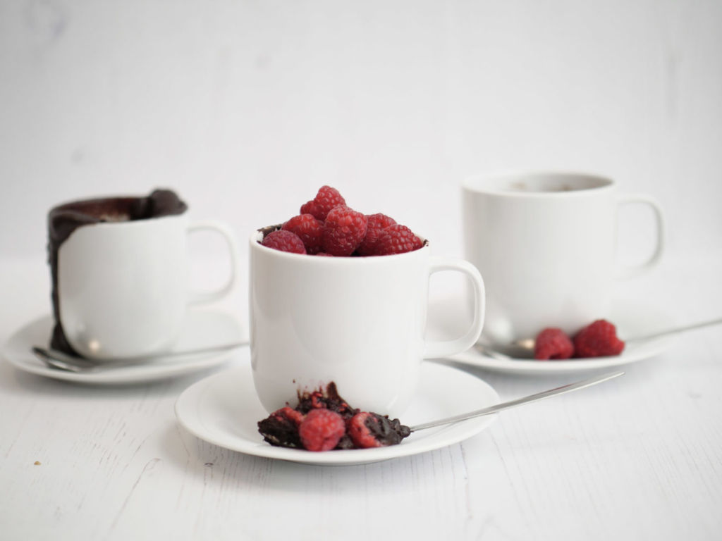 Si prefieres tomar un descanso del chocolate, sin duda es momento de que disfrutes de un delicioso pastel frutal,  que es igual de rico.  Te recomendamos utilizar una mermelada de frambuesa de buena calidad y frambuesas frescas para equilibrar el sabor dulce.  Es más fácil para mezclar los ingredientes en un tazón grande y después verter la mezcla en tu taza preferida.