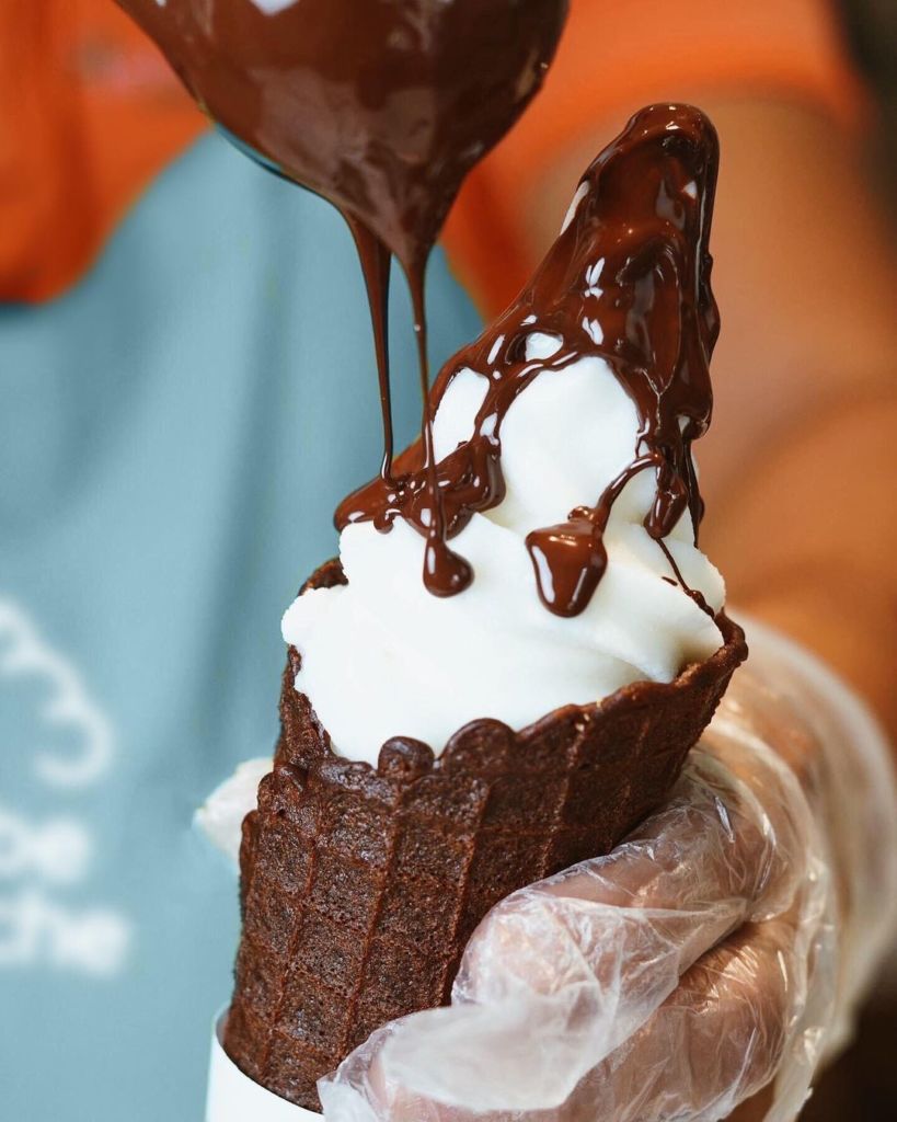 Nube de Leche cuenta con sabores de temporada como el de flan o arroz con leche, sin embargo, cada semana lanzan dos sabores a base de leche como el choco avellana y cacao. Todos los helados se pueden pedir con toppings ilimitados y tu decides si lo quieres en vasito o cono. Aunque el más popular es el cono de waffle con nube de algodón y helado.