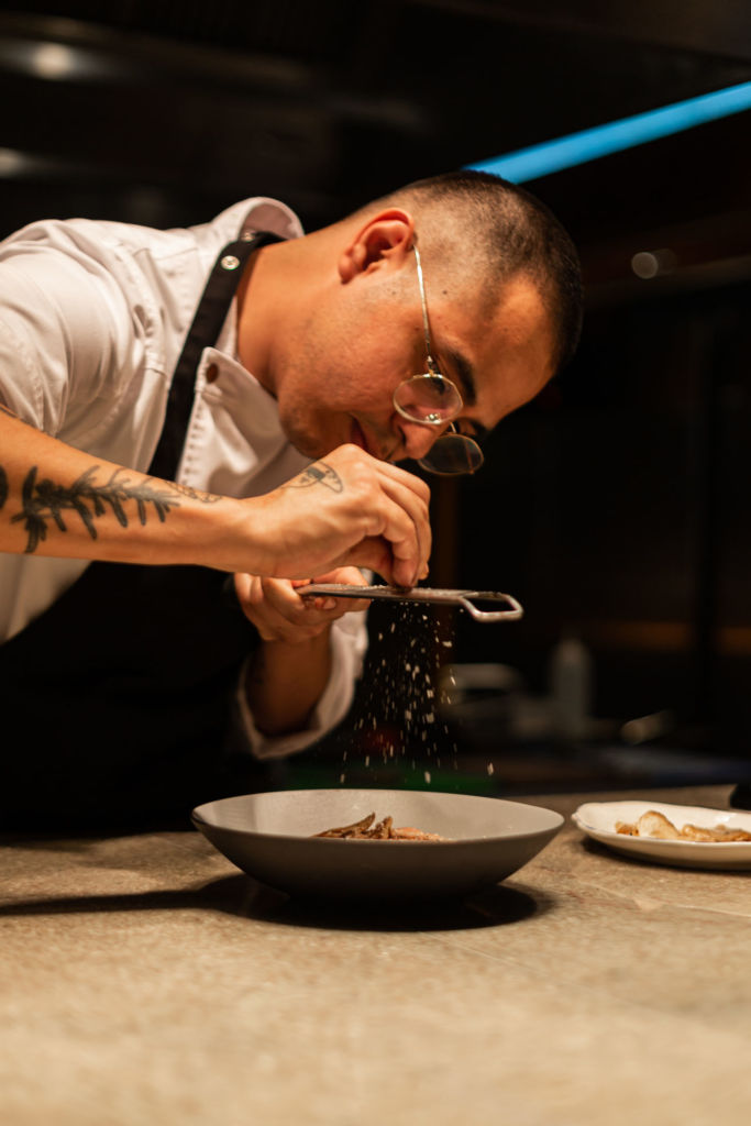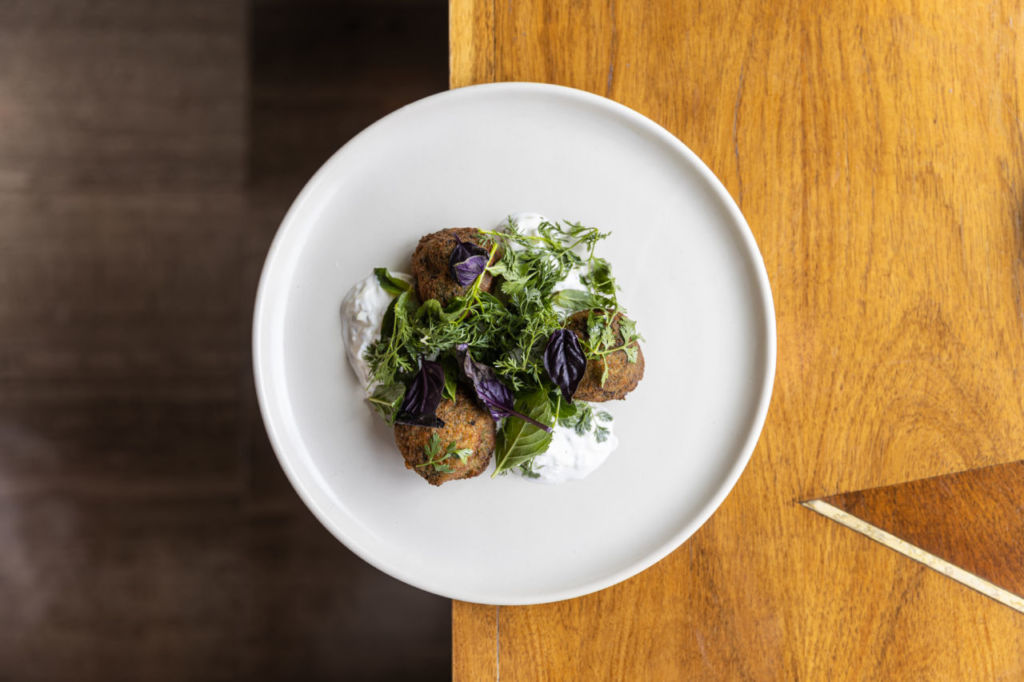 Algunas de las creaciones más destacables son su ceviche púrpura —King kampachi con leche de tigre de col morada, xnipec de col y aguacate— y su taco de pastor Balta —lomo y por Bely marinados en aguachile con piña a la leña—. También hay entraditas perfectas para pedir al centro de la mesa, como su aguachile amarillo de callo de almeja o su falafel de habas y quelites.