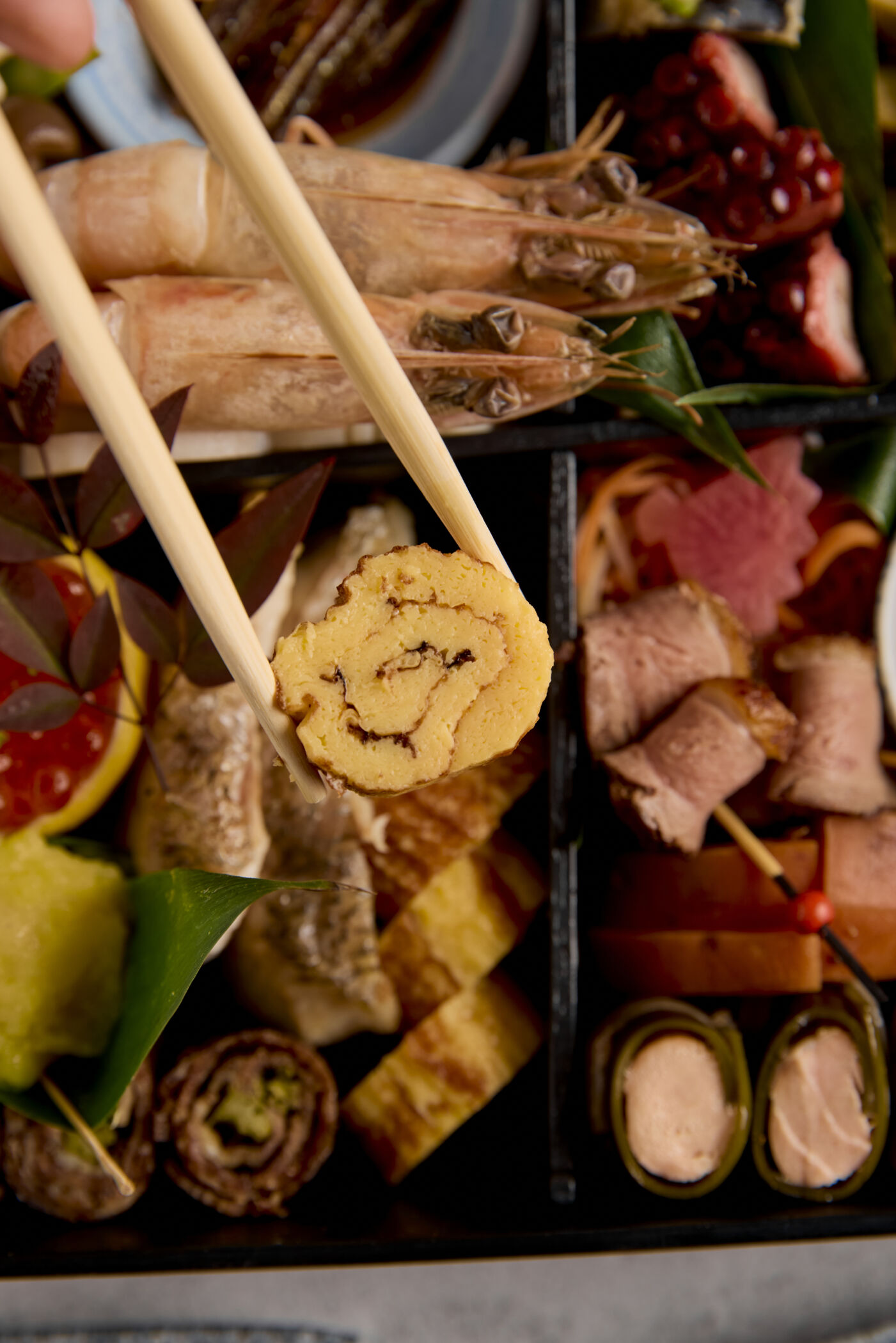 El Osechi Ryori de Yoshimi consta de 19 platillos acomodados cuidadosamente en un jubako. Destacan recetas como el Tazukuri —sardinas deshidratadas con salsa dulce que evocan abundancia—, el Kamo —magret de pato dulce para la buena fortuna— o el Kombumaki —un rollo de kombu con salmón para la alegría y el éxito—. Esta cajita coqueta se acompaña con un trío de sashimi, un sekihan de arroz glutinoso con frijoles azuki, un caldo de pescado y un wagashi de frijoles dulces y matcha como postre.