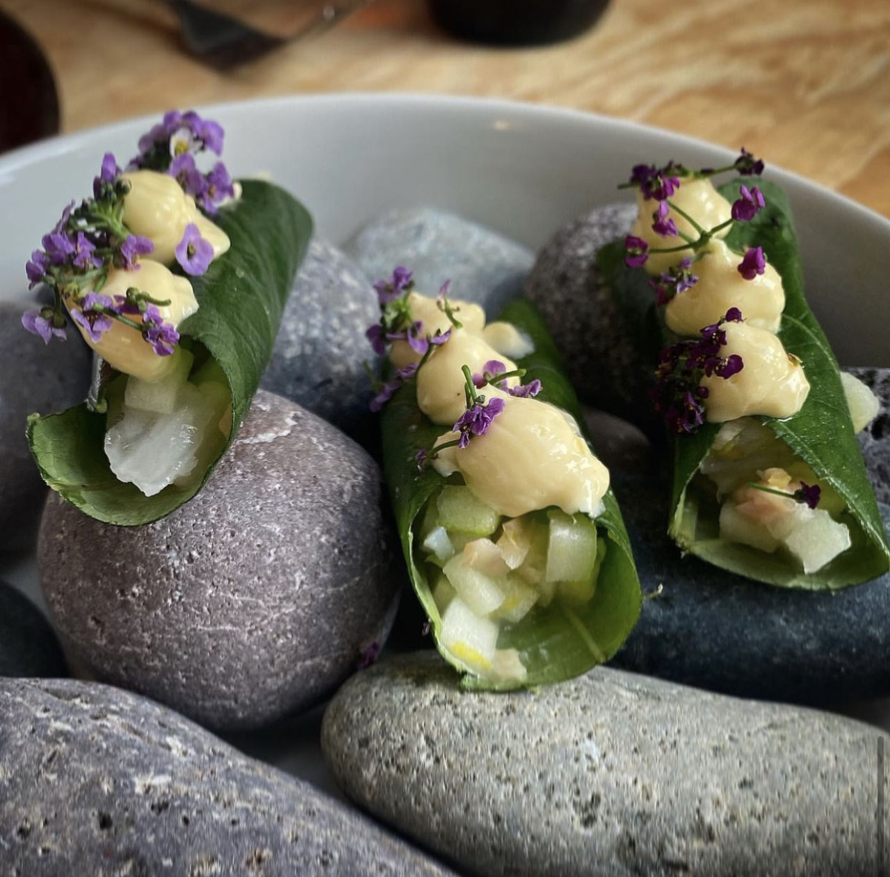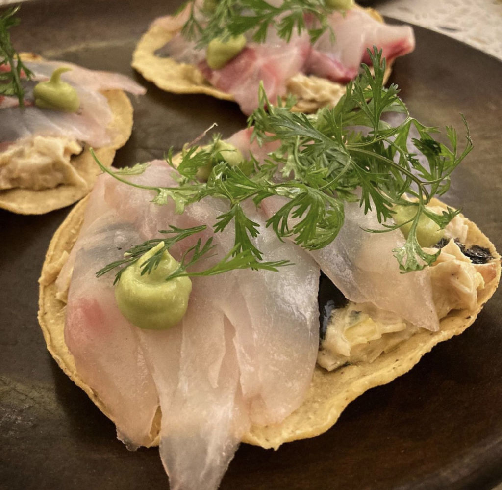 En su corto pero conciso menú encontrarás especialidades del mar con un toque personal y creativo del chef; Kampachi al grill con chintextle –una pasta de chiles ahumados típica de Oaxaca – y mojo verde; flatbread con pesto de quelites, burrata, chutney de limón, bottarga di muggine y aceite de chiles, esta última es todo un juego sensorial en el paladar. En las entradas destacan los crudos; ceviche de lubina –hoja santa y leche de tigre de coco con alioli de jalapeño –, crudo de jurel con emulsión de habanero, zumaque y vinagreta de kumquat con pirul.