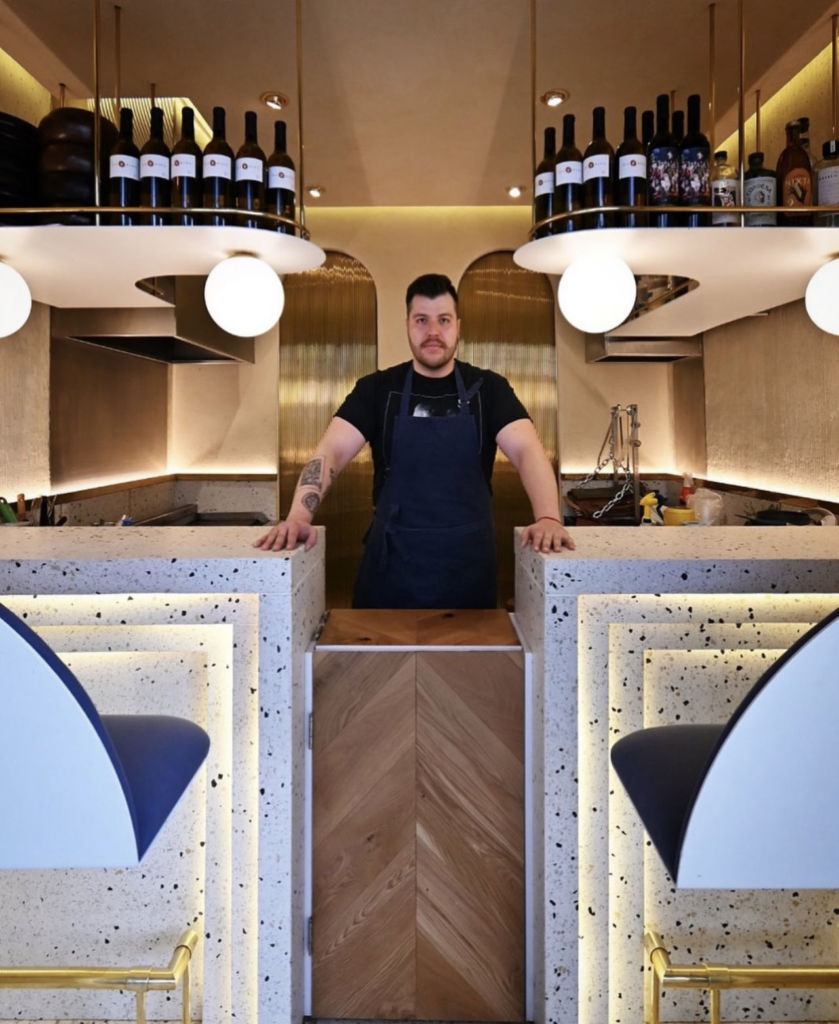 El mundo culinario ha evolucionado dando vida a proyectos que ya no solo se preocupan por la comida; también buscan que sus invitados tengan experiencias sensoriales y visuales únicas, por eso Pargot es tan especial. Al frente del local puedes observar dos periqueras, unas barras altas que se engalanan con un soporte dorado que muestra la variedad de vinos y destilados del local. Retomando algunos elementos de Art Déco de los años 20 que entrelazan simetría y geometría, se pueden ver los lambrines bajos en la barra que se compone de micro terrazo de concreto blanco con piedras azules, grises y amarillas, dando una remembranza a la arena del mar.