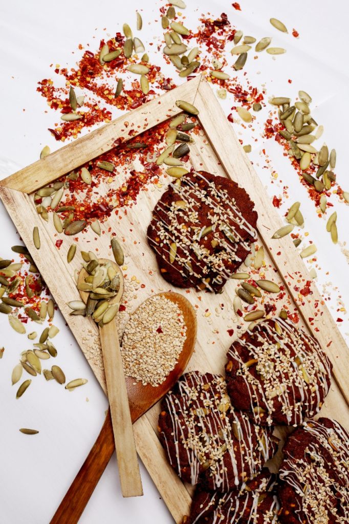 Otro de los nuevos integrantes de su menú es la galleta de mole poblano, ideal para los paladares más curiosos. La elaboran con una mezcla de mole poblano, chocolate, pepitas y almendras; su decoración de ajonjolí y chocolate blanco le dan un acabado irresistible y crujiente.