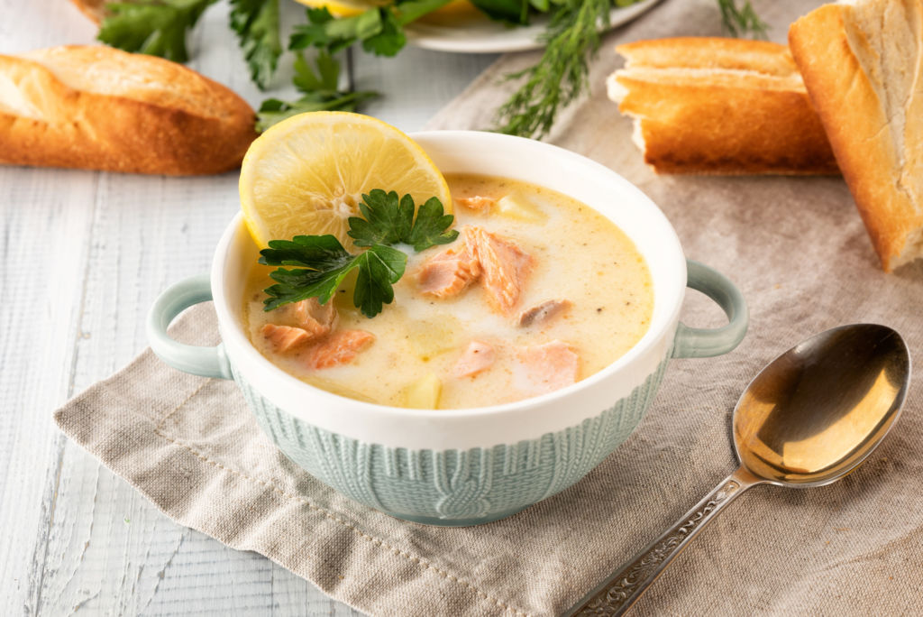 Sopa de poro y papa con salmón ahumado y whisky
