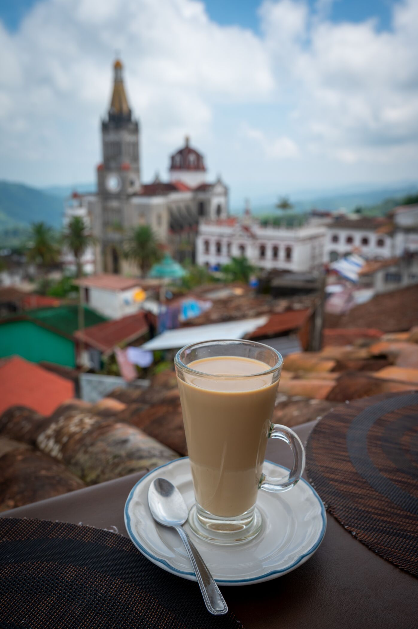 taza de café sobre una mesa con vista a un pueblo