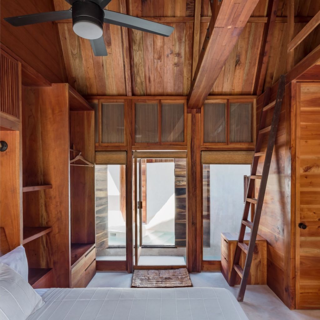 Parte de su encanto se centra en sus enormes estructuras formadas en cedro rojo occidental, el cual se cultiva en la plantación de la familia. Además de sus hermosas palapas elaboradas en paja, las cuales le dan un estilo muy característico de la costa mexicana. Las habitaciones de Punta Caliza tienen un interiorismo minimalista que te permite conectar con la naturaleza, gracias a sus hermosos espacios abiertos.