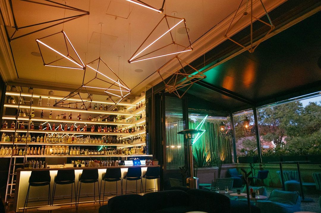 Todo en Rayo Cocktail Bar emana un espíritu vanguardista y electrificante. Para acceder a su terraza tendrás que subir primero por un hermoso elevador vintage, que te dará entrada a un espacio que respeta la esencia clásica de su construcción, pero con una increíble renovación contemporánea liderada por el estudio de arquitectura FPG. Apreciarás una gran barra de mármol con fondo de espejo, pisos en mosaico tradicional, mueblería colorida y una destacable luz neón en forma de rayo.