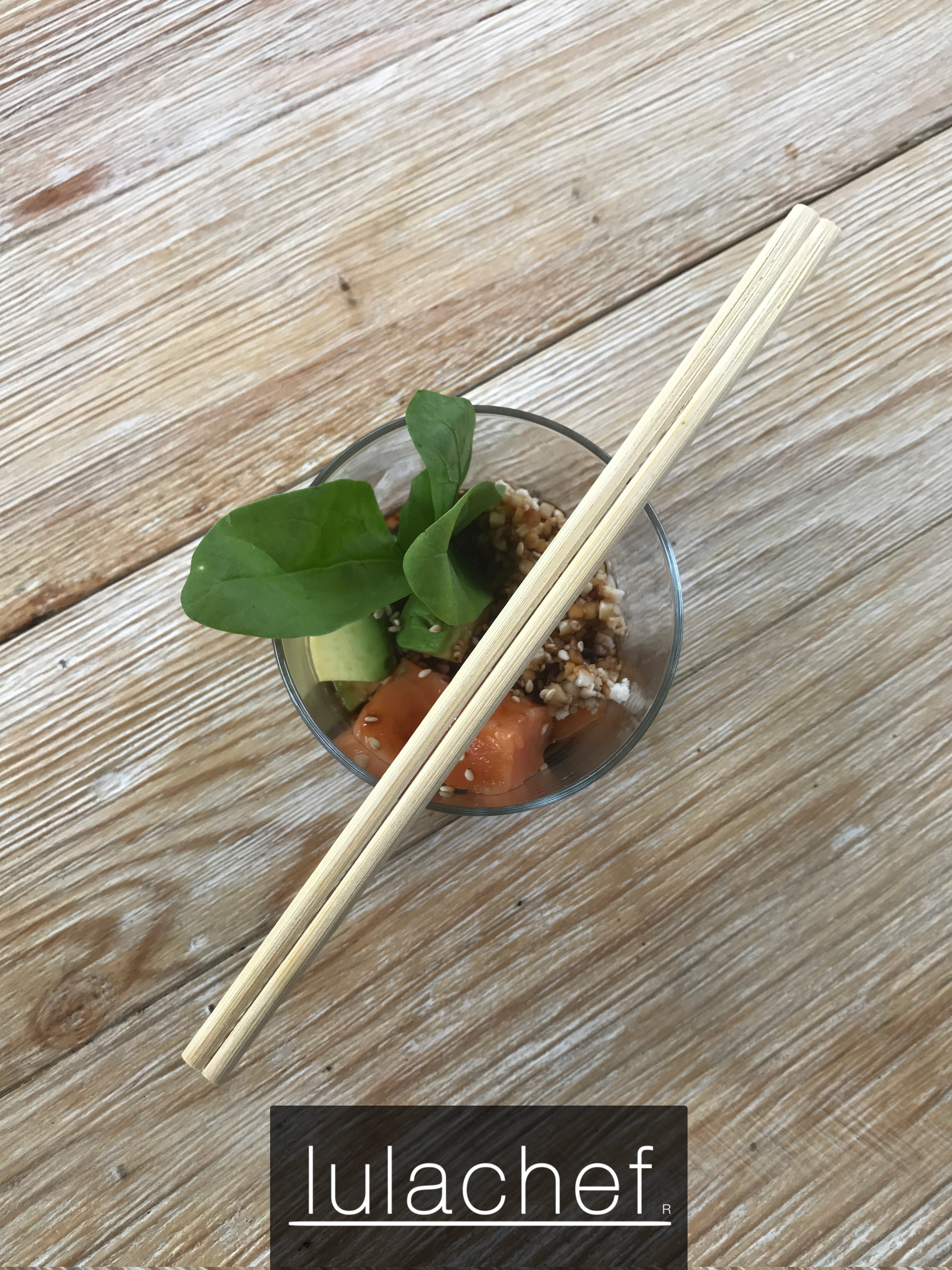 caliente. Servir un poco de la soya preparada. Encima poner un montoncito de salmón