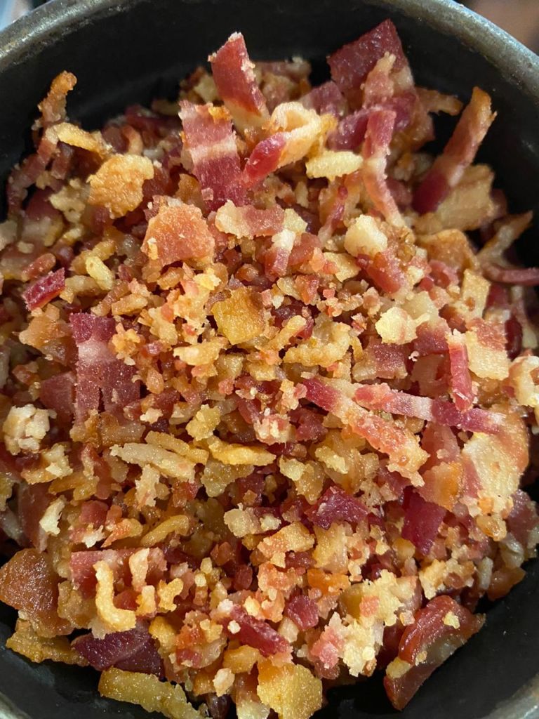 Colocar el tocino en una rejilla y meter al horno pre-calentado a 180 grados hasta que esté crujiente. Una vez que se enfríe, picar el tocino en pequeños trozos. Los hornos de Monogram cuentan con quemador infrarrojo que produce calor intenso necesario para dorar carnes y preservar los jugos; está controlado por un termostato para proporcionar un dorado superior cuando se hornea de forma convencional o con convección. Esto logra que el tocino quede realmente dorado y crujiente.