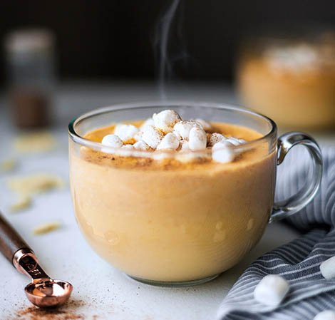 Bebida caliente de chocolate blanco y calabaza