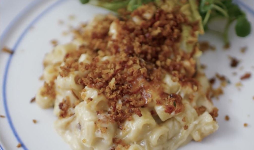 Mientras eso se hornea, pica y fríe en una sartén el tocino, con tomillo y un diente de ajo, cuando se empiece a dorar, agrega el pan molido hasta que esté todo dorado y crujiente. Sirve los macarrones con el pan molido encima y acompáñalos con lechuga.
