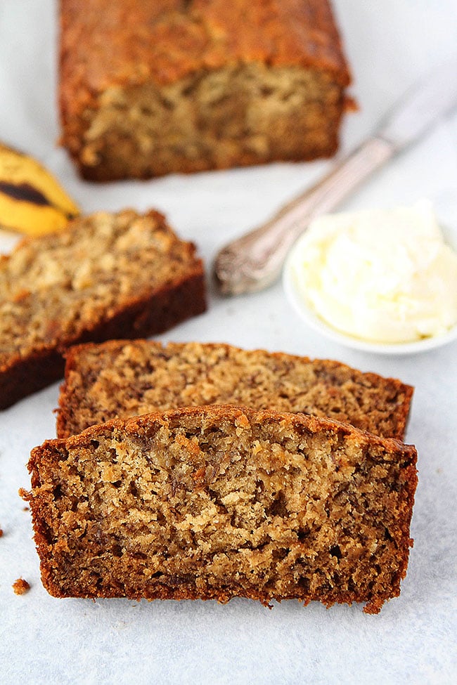 Revuelve los ingredientes secos en los ingredientes húmedos, no mezcles demasiado. Si mezclas demasiado, el pan se aplanará y terminará muy denso. Vierte la mezcla en el molde preparado. Espolvorea generosamente con azúcar morena, si así lo deseas. Hornea durante 50-65 minutos, o hasta que un palillo insertado en el centro del pan salga limpio. Verifica el pan a los 50 minutos, solo para estar seguro. Al retirarlo del horno, deja que se enfríe por 10 minutos. Corta en rebanadas y sirve.