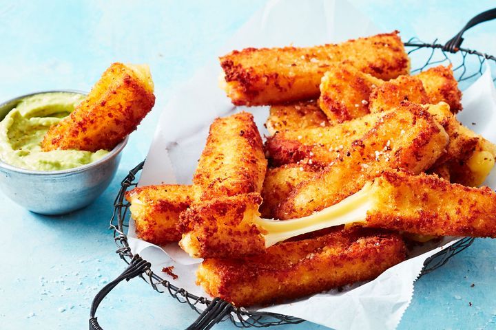 Rocía los palitos de mozzarella generosamente con aceite. Cubre la canasta de la freidora con papel de hornear, dejando un borde de 1 cm para permitir que circule el aire. Cocina los palitos a 180º C, en tandas, durante 4 a 5 minutos o hasta que estén dorados y crujientes. Sirve inmediatamente con la salsa de aguacate.