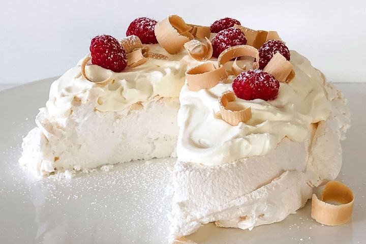 Usa una espátula grande para transferir con cuidado la pavlova a un plato para servir. Cubre con crema batida, frambuesas y ralladura de chocolate. Espolvorea con azúcar glas.