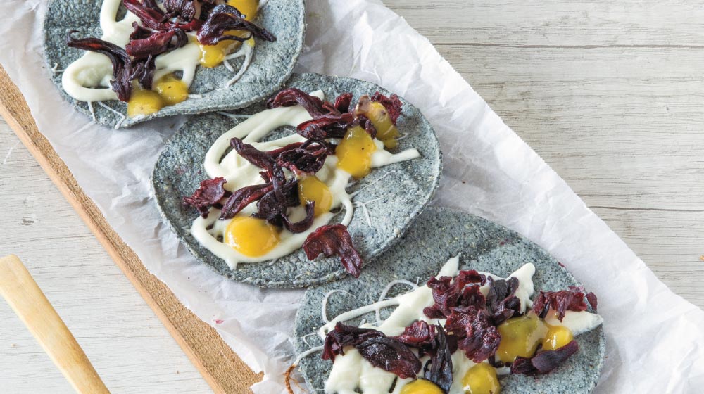 Tacos de jamaica con salsa de mango y habanero