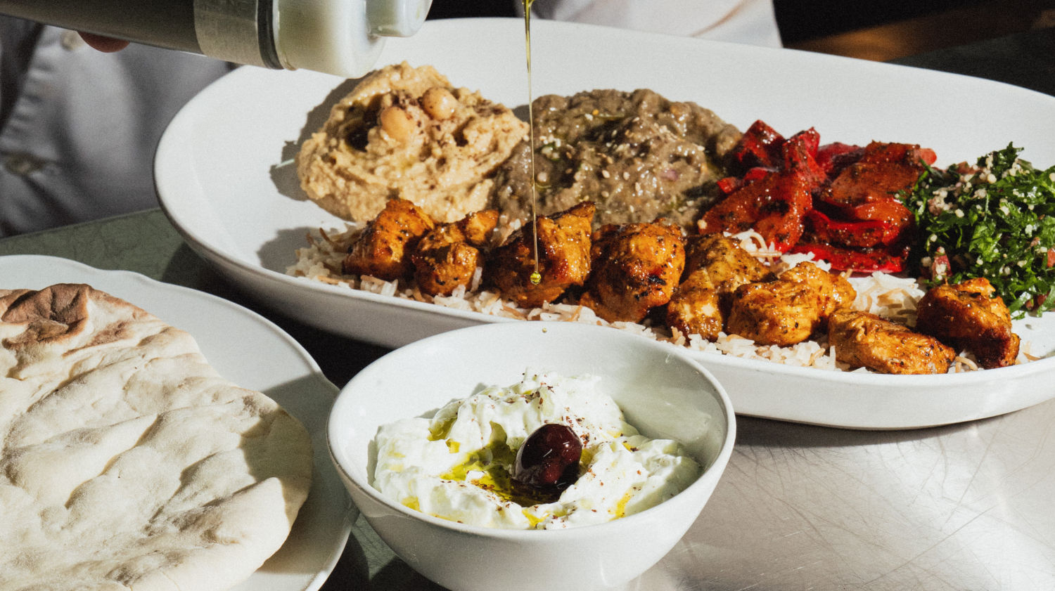 Otro que destaca es la chuleta ahumada de cerdo, acompañada de un cremoso puré de camote, ensalada y una salsa de hongos que amarra todo el plato. Y para los de buen apetito, los kebabs son un imperdible: hay de res, pollo o camarón, y vienen con hummus, babaganoush, tabbouleh, tzatziki, arroz libanés y pan pita hecho en casa, un homenaje a la cocina mediterránea. También hay otras opciones que vale la pena probar: carpaccio de betabel, entradas como el dip de alcachofa o la cazuela de hongos. En los platos fuertes encontrarás un jugoso rib eye, hasta pulpo con adobo maya –una receta especial del chef–, además de pastas y pizzas que completan la oferta.