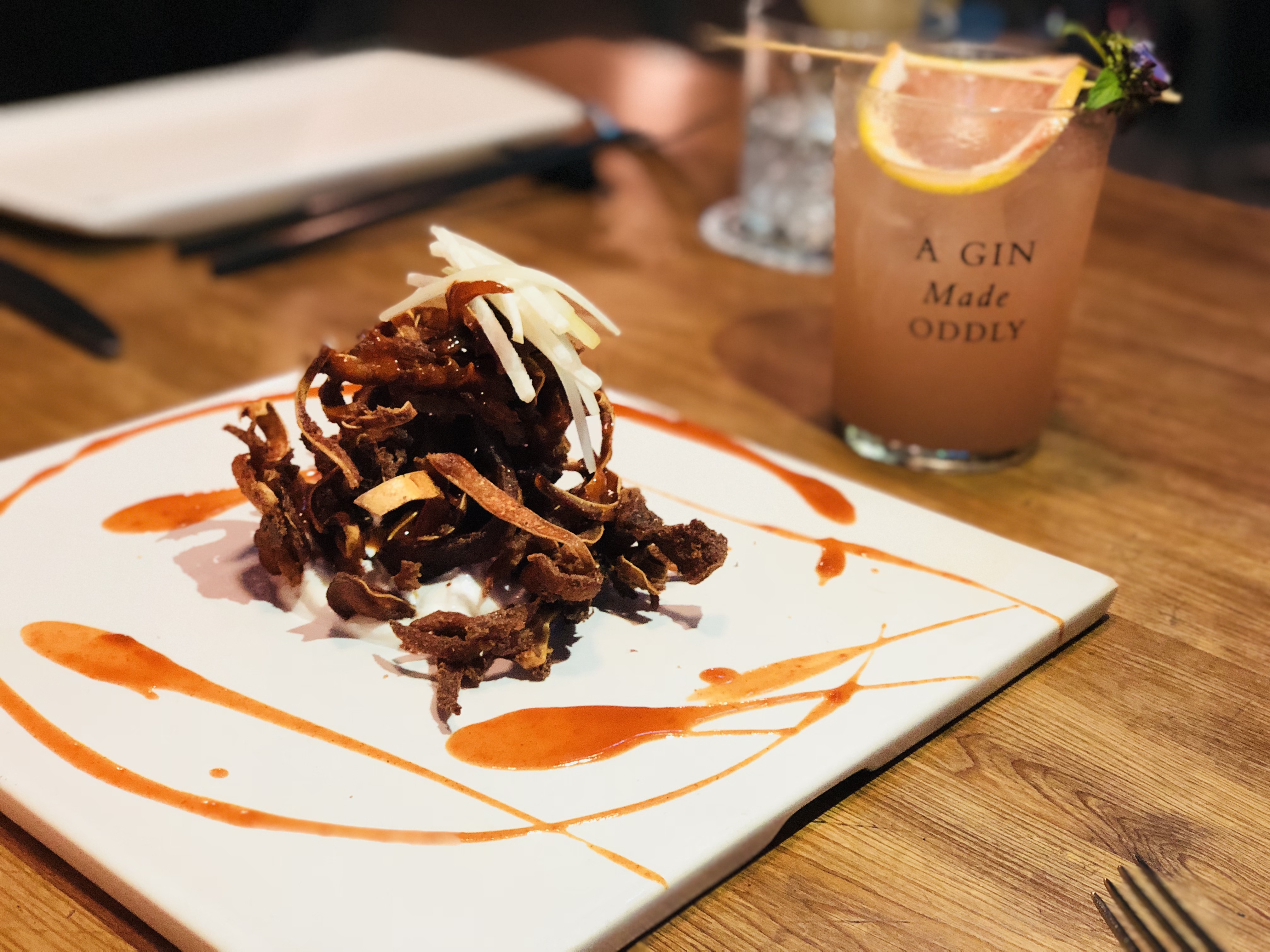 Junto con el tuétano, probamos uno de nuestros platillos favoritos de la noche: las orejitas de cerdo fritas y servidas sobre tzatziki y salsa hot, cuya textura crujiente y contraste de sabores con la salsa y el tzatziki fueron simplemente una combinación de diez. Si las pides ten cuidado, pues son sumamente adictivas y probablemente volarán de la mesa.