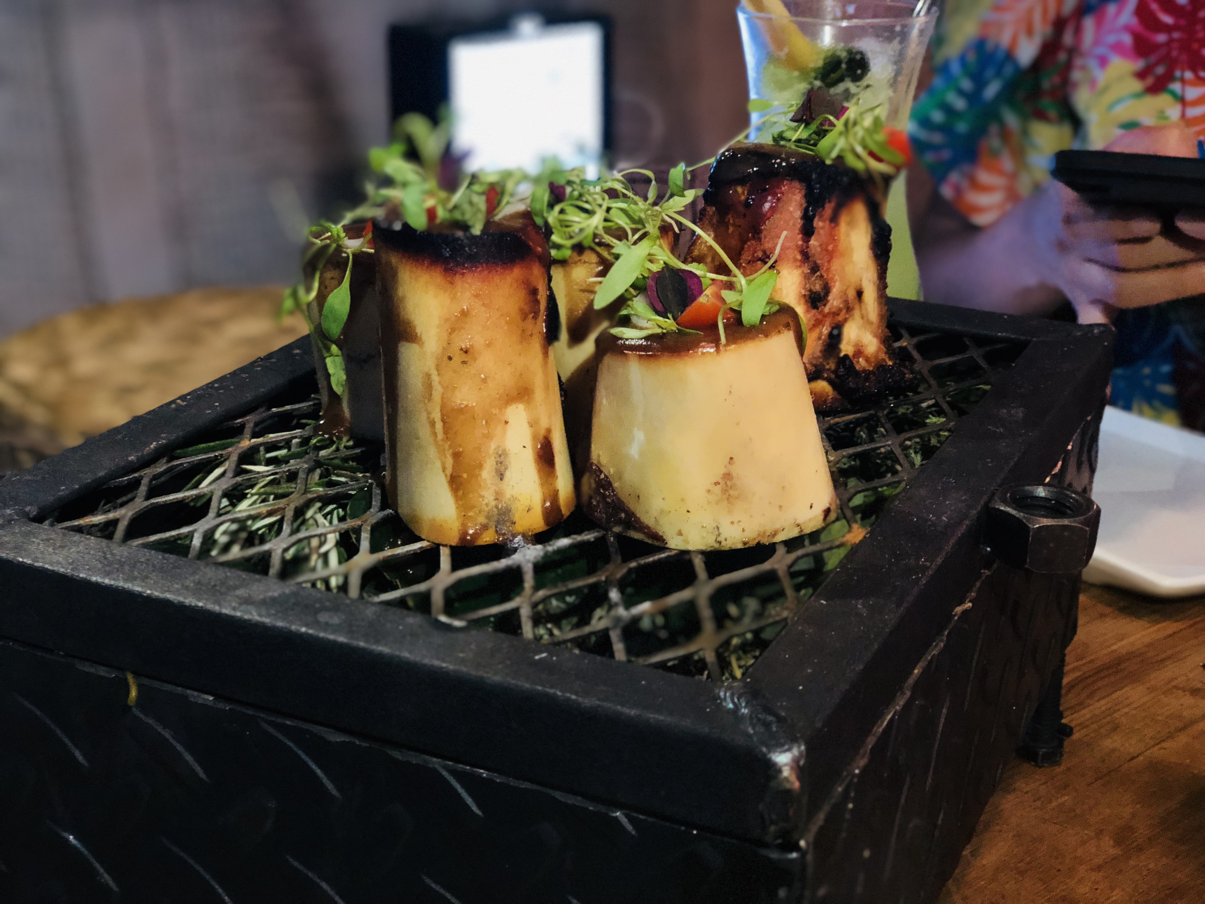 De vuelta en nuestra mesa, llegaron frente a nosotros dos entradas que forman parte del menú degustación de Nudo Negro –para este punto debemos decirte que es uno de los menús degustación que consideramos que cuentan con el precio más justo de toda la CDMX, con un costo de $680 pesos por persona–. Una de las entradas que probamos fue el tuétano de res a las brasas, con reducción de jugo de carne con tomillo y limón, jitomate, vinagreta de mirin, rabo de cebolla, quelites, salsa de chile mixe y tortillas de maíz. Una completa delicia que sin duda no puede faltar durante tu visita.